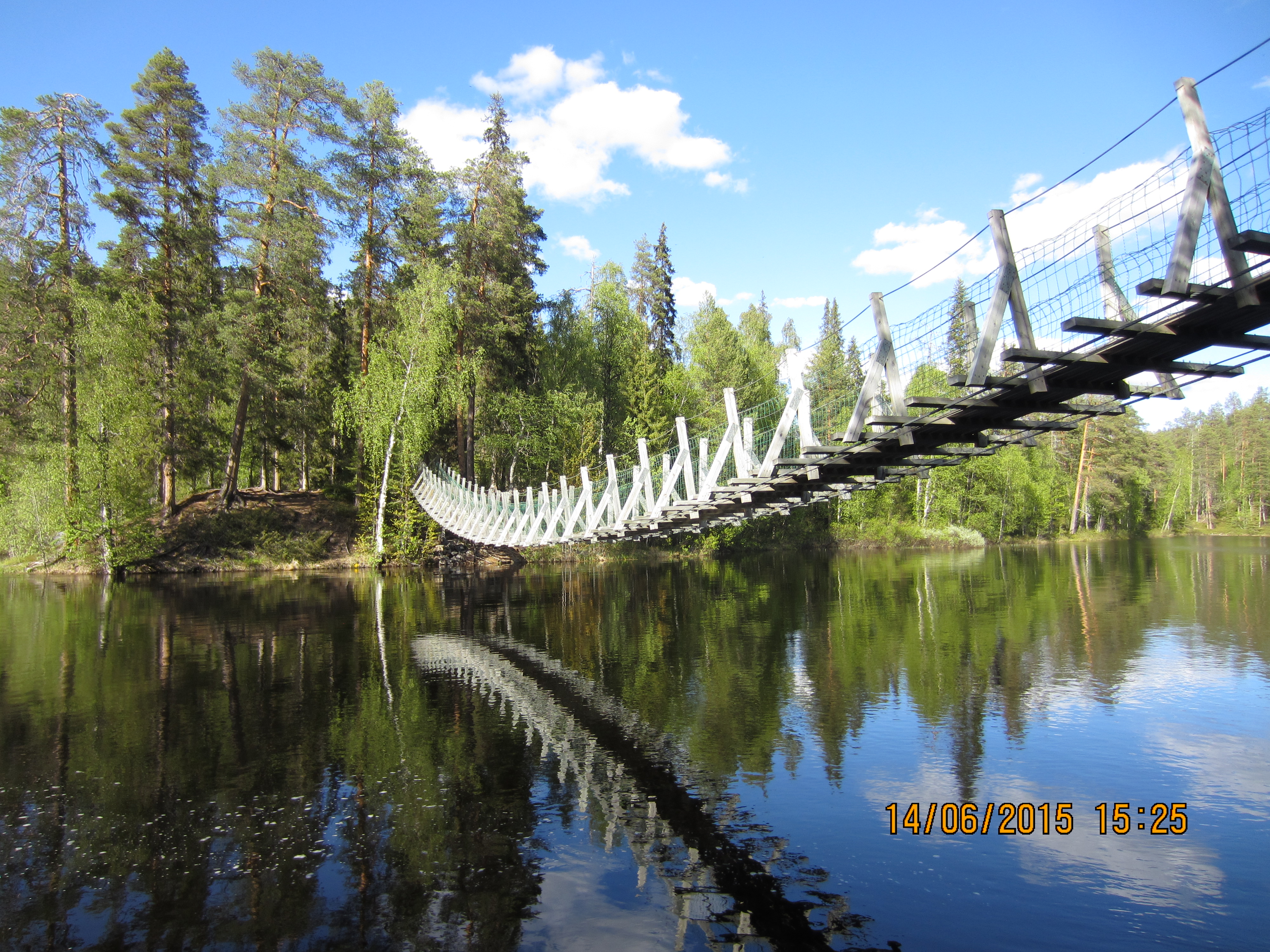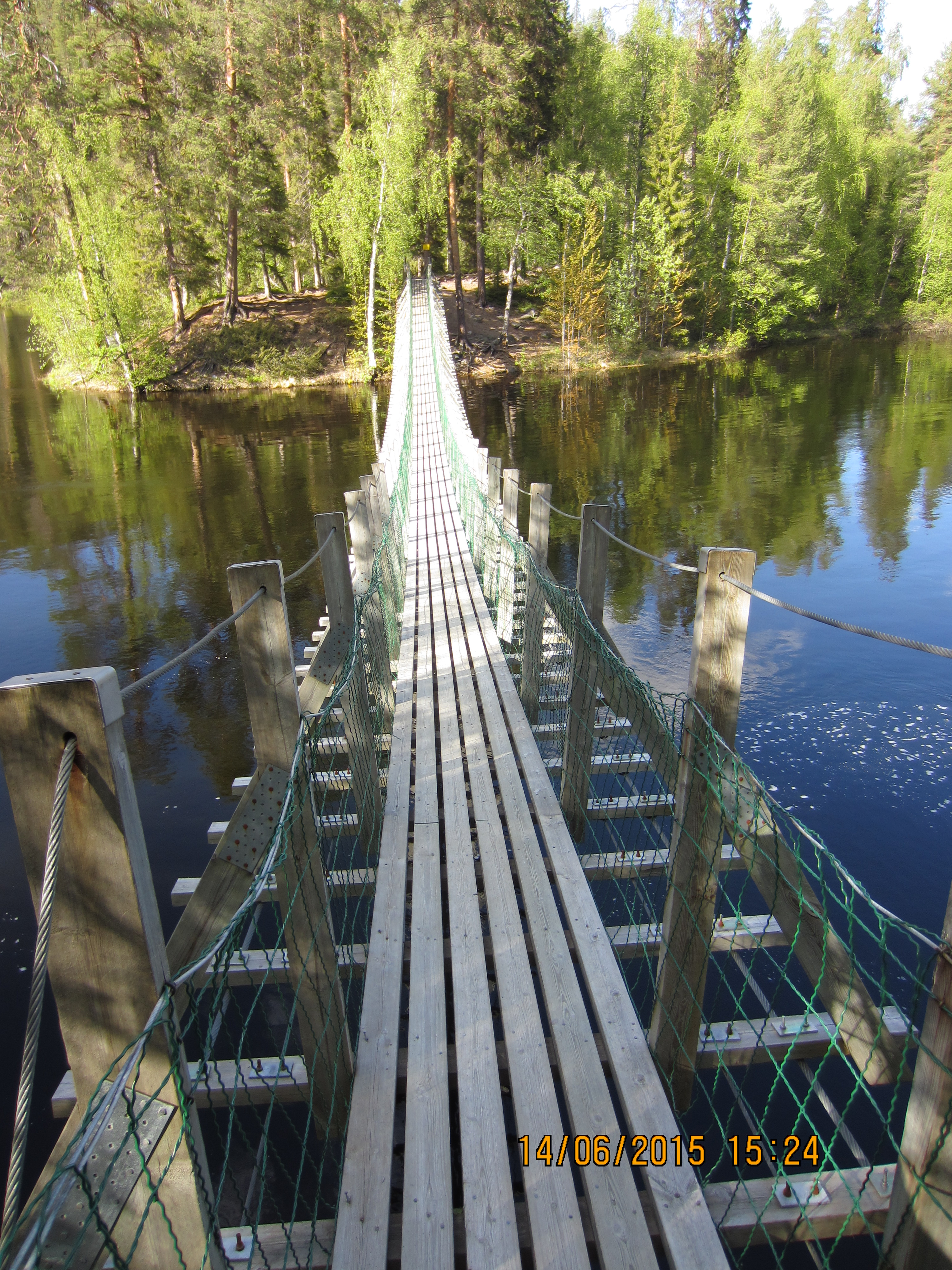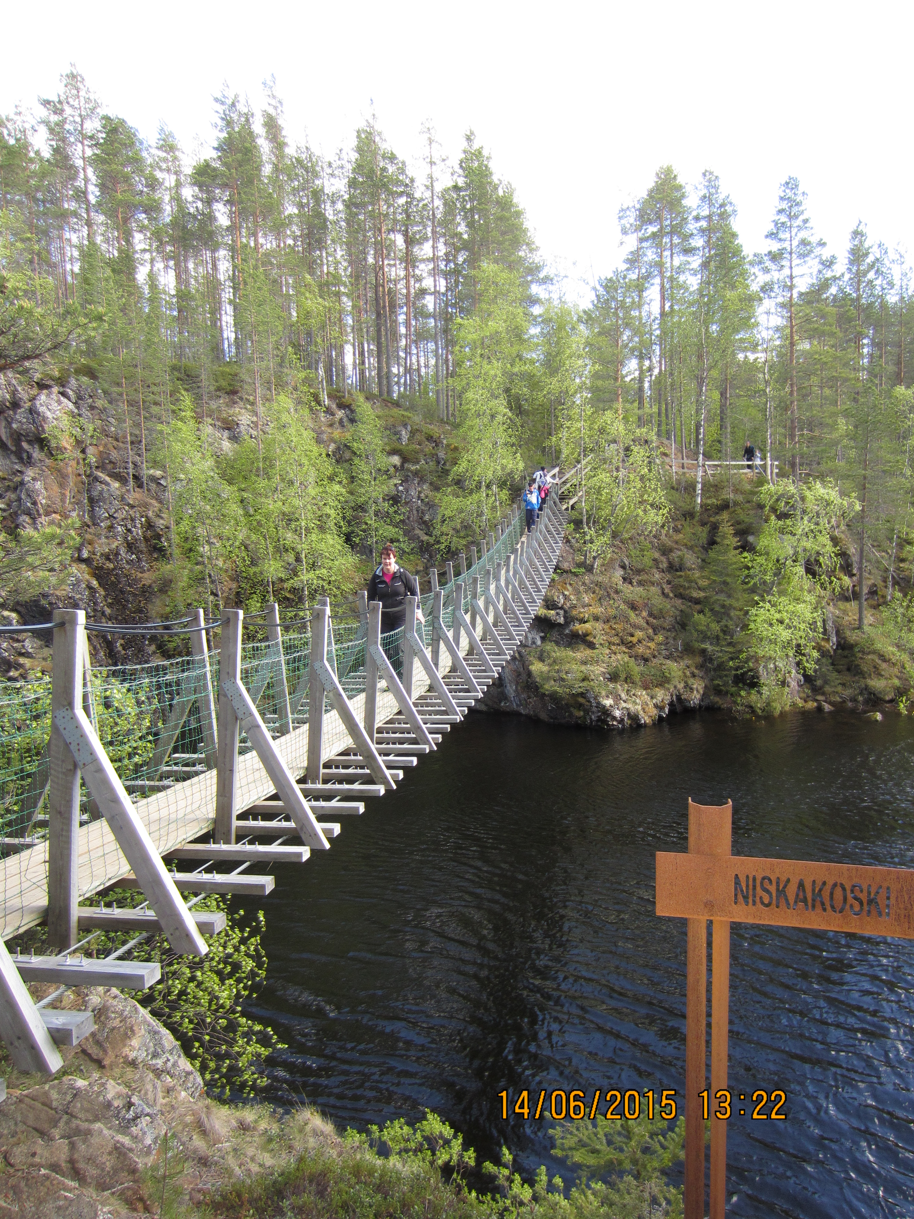 Thence to the Oulanka National Park, specifically Juuma, for a truly memorable hike over 12 km known as the Little Bear Ring, via rope bridges, rapids and gorges. Indiana Jones and Mrs Jones. But no swinging … on ropes of otherwise! Guide book described it as one of the most scenic Finnish walks. Both of us agreed that this is one of, if not THE, most interesting and scenic walks we have ever done. Pix can speak for themselves – sorry there are so many, but it was truly lovely. Had taken only the little Canon instamatic, but still pleased with the quality. Do check out the water reflections – superb.