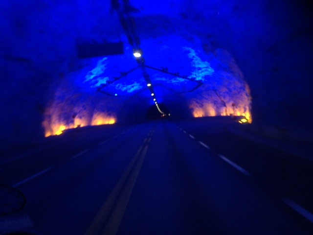 And driving around the fjord also takes time … slow bends, two ferries and lots of tunnels.  One tunnel was 16 miles long.  Claimed to be the longest in Europe – does anyone know any better?  There were a couple of wide emergency places built in; they looked like the inside of glaciers due to the lighting: