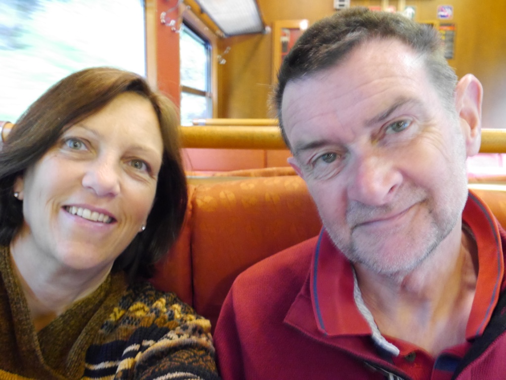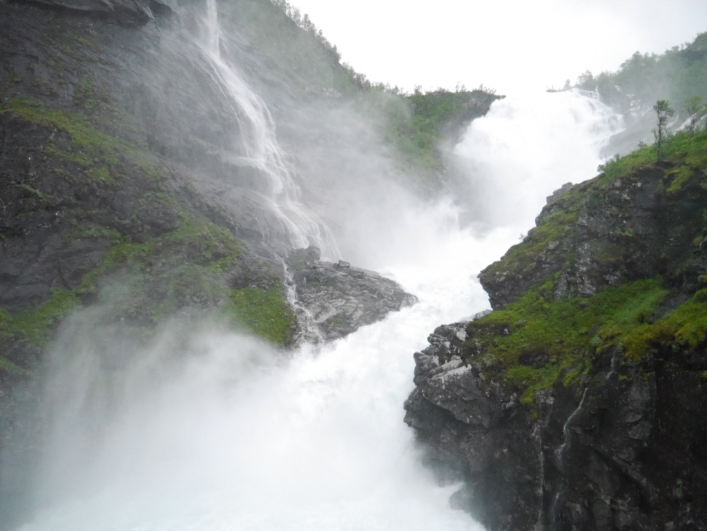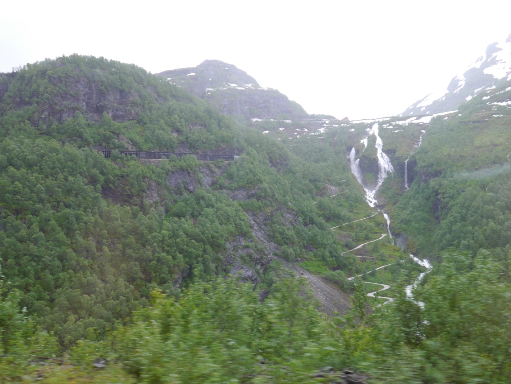 Drove to Flam (passing the crowded campsite!) and the visitor centre printed our tickets for us.  Breakfasted and onto the train.  Pretty empty .. would this be due to the weather?  Rather sodden and increasingly wet.  An American couple told us the train was fully booked tomorrow; I suppose it depends when the tour groups get in.  Last time K did this with the Aged Ps and Maddy it was even wetter and mistier, so a slight improvement there.  Nice scenery:  at one point you can look up the valley and see the hairpin path and the shuttered railway track.  The train stops at a waterfall for passengers to take pix.  There is also a dancing blonde and red clad siren swaying to music at this point … one of the local legends.  However, the scenery is nothing compared to further north.  If the weather had been better, we could have taken the bikes up and cycled / free wheeled the 21 km back down.  Perhaps next time … third time lucky with the weather.