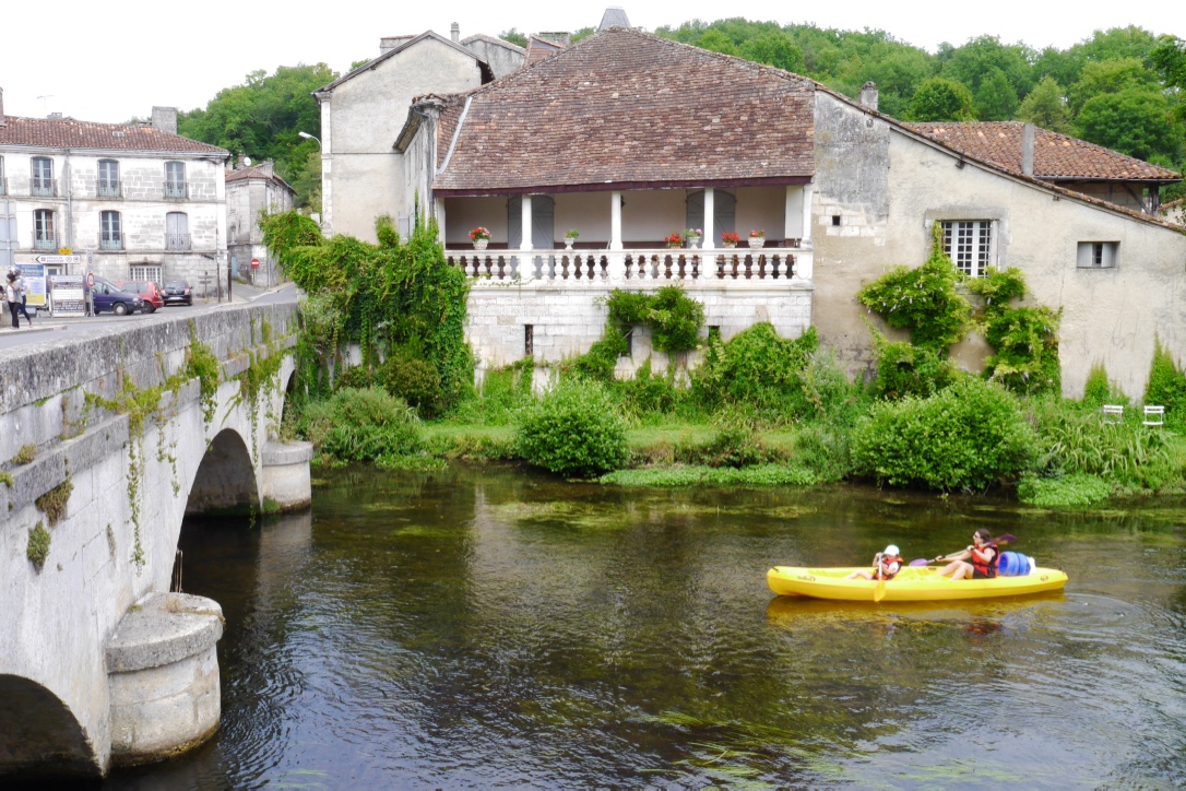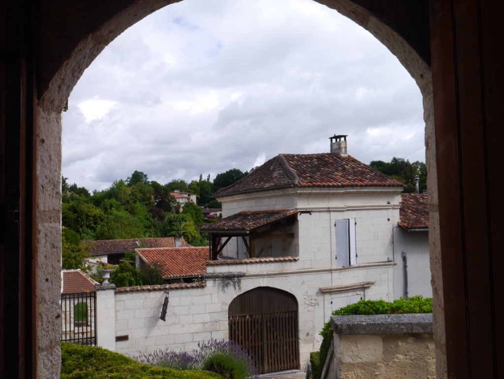 We had our morning coffee in Aubeterre and then a wander around the town. Built on a cliff with a sub-terranean church (for another time) and lots of narrow streets. As we walked through an old codger, stopped K and J and gave a mini history into his street. This was the oldest building with a massive cellar that stretched across the street to the cliff and had a window looking out onto the chateau. This was the site of the old wooden bridge which was the main entrance to the medieval town. This was the wall that was adjacent to the route to the old bridge and went a further 7 metres below. This was the building that was having some renovation work and when they peeled back the plaster they discovered the remnants of windows and a big arch door … it had been a church … you could see the outlines of windows and door. He told the story that an old neighbour living there was complaining that her dog kept digging up the garden. After a while said hound brought her a petal cadeau … a human bone … the garden had been the cemetery!