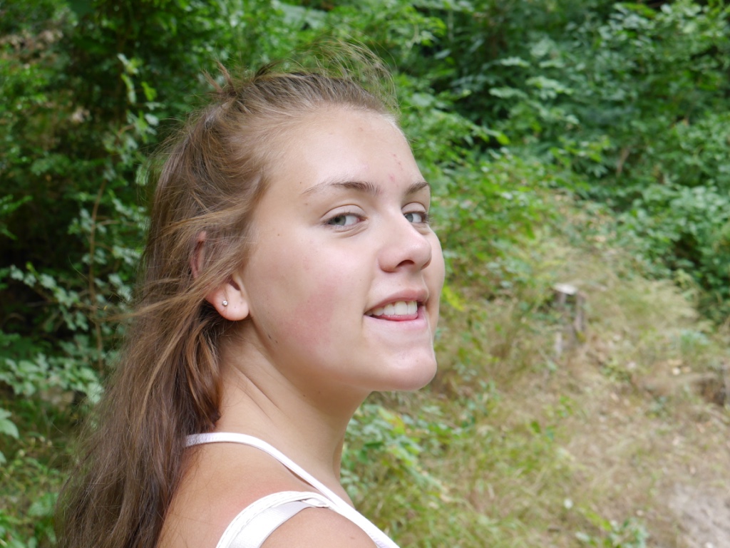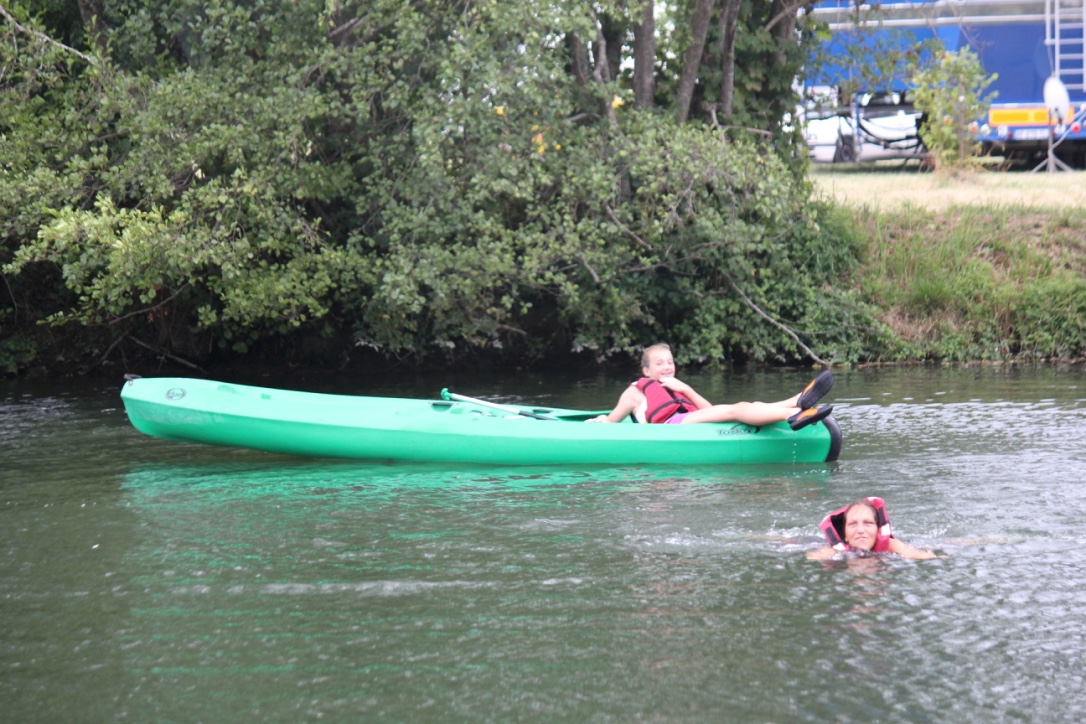 After lunch down to the river near Aubeterre for canoeing.  Louis was solo, but after assuring James that Niecey would NOT capsize him … K with Zoe and J with Niecey.  Just at the point of departure Clare and co started bigging up the ‘OBSTACLE’.  Something to do with a disruption of the river flow!  We were taken up river with the canoes and left to wend our way gently down stream, enjoying the peaceful sounds and sights of nature … NOT.  We had attempted boardings, attempted oar stealing, zig zags from one bank to the other (K and Z), ramming and turning each other around.  Louis’ new rubber sandal went overboard in the attempt to draw him off.  The obstacle was a weir … with a chute and then a drop for canoes.  None of us managed to topple out, despite being told to hang on … quite what to we are not sure!  Zozo decided to ride the canoe like Boudica until she toppled in.  K then joined her for a river walk but could not re-enter the canoe until it was fairly shallow.  The picnicking family only offered her water (bah!) when she asked for ‘un petite verre”!  Zozo, fed up by now with standing in the canoe became the masthead, but at the back and sabotaged any directional work K was doing.  Exhausting! And memorable!