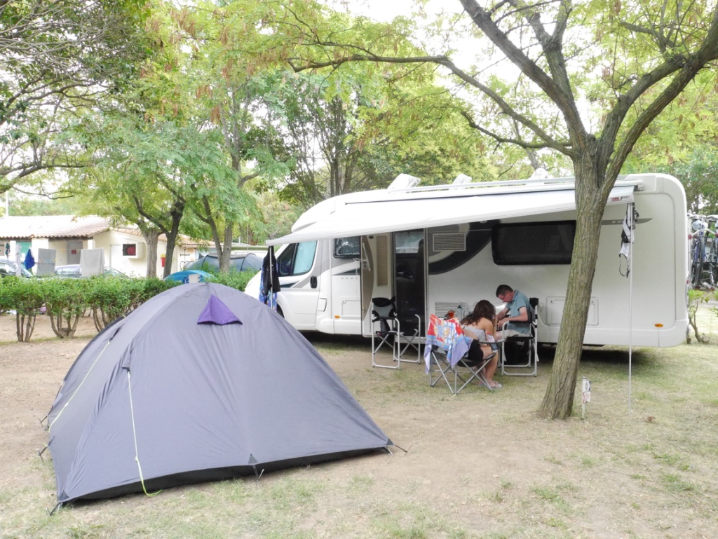 J googled a campsite in Saint-Gilles on his phone, but actually we could NOT have missed the huge banner across the road.  To get a pitch that would take the >8m of Chardonnay and allow us to open the door, we ended up on a pitch with electricity … such expense!  But we have a super large pitch and put the awing out!