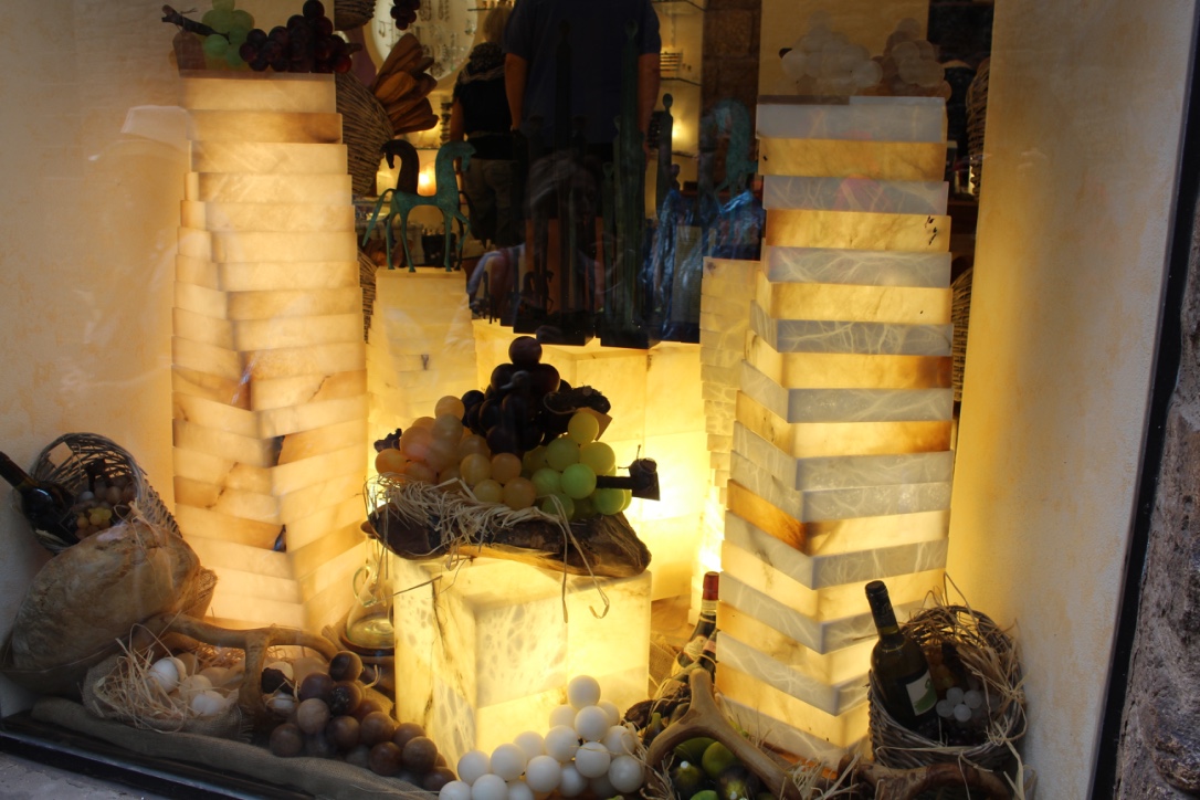 Volterra is known for its alabaster … apparently it is soft compared to marble and can be carved using wood working tools. It just glowed when back lit. A few of the windows in the Church had been filled with the opaque marble, which glowed and still let in some light.
