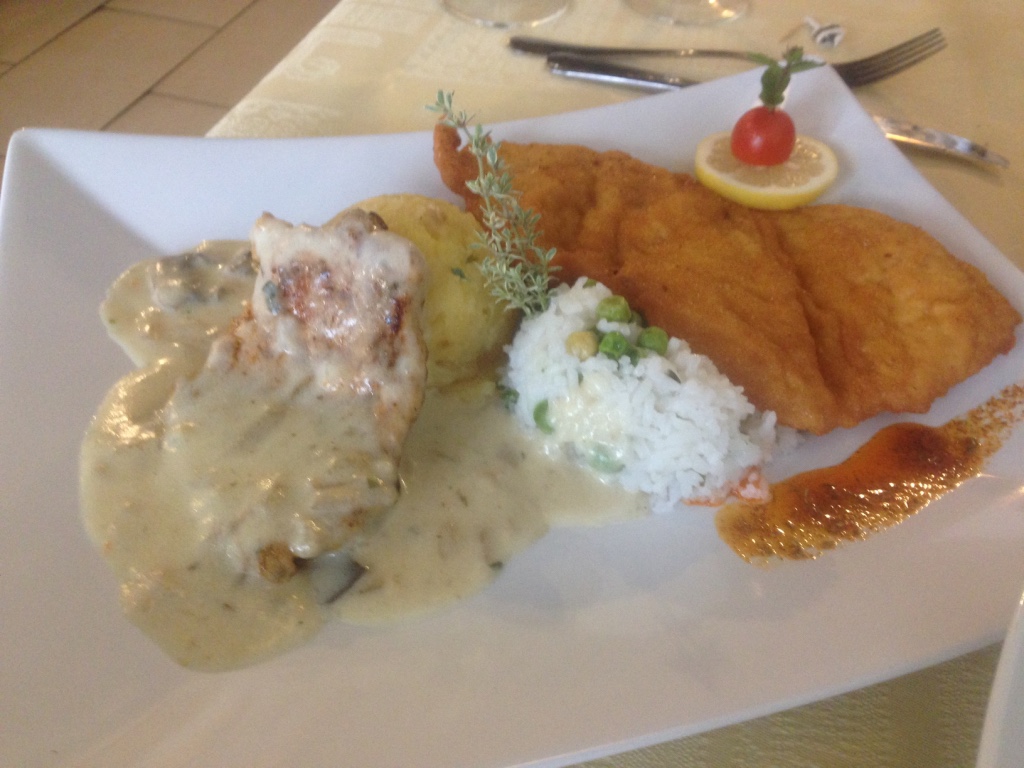 Pork in a creamy mushroom sauce with mash and tenderest fried chicken with rice … two meals in one! And three fresh herbs too.