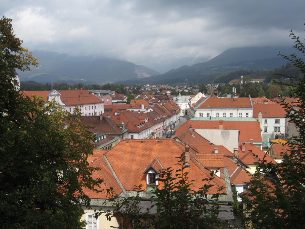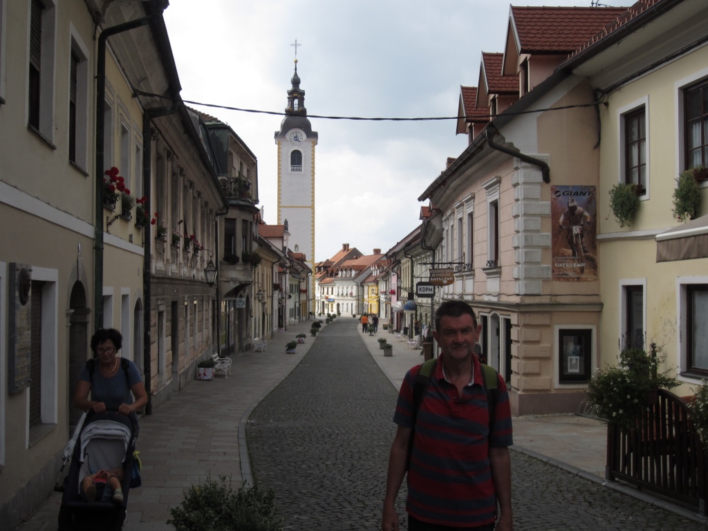 The Ljubljana TIC had suggested Kamnik as a train destination out of the city. As we arrived, we had that deja vue sort of feeling. We had stopped off here to find a pharmacy for ear drops, or was it eye drops, for James some weeks ago. However, this time we did the town properly: walking tour of castles, town wall and Franciscan Monastery. The lady in the TIC had suggested a lunch venue, frequented by locals. We both had a daily special at EUR4.30 and 4.50: pork in sauce with noodles and buckwheat pancakes with leeks and the local Velkina Planina cheese, both with salad and both yummy … and washed down with a carafe of white.