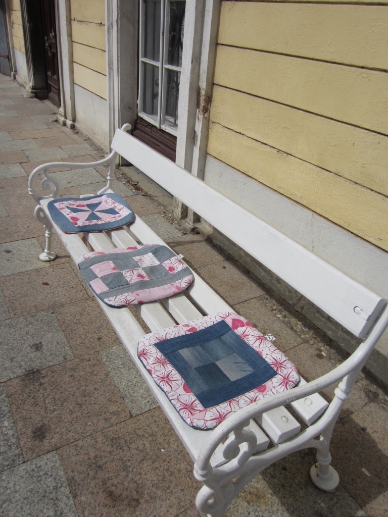When we stopped by a few weeks ago, the benches had rolled up magazines to read. Now they have cushions …. lovely ideas.