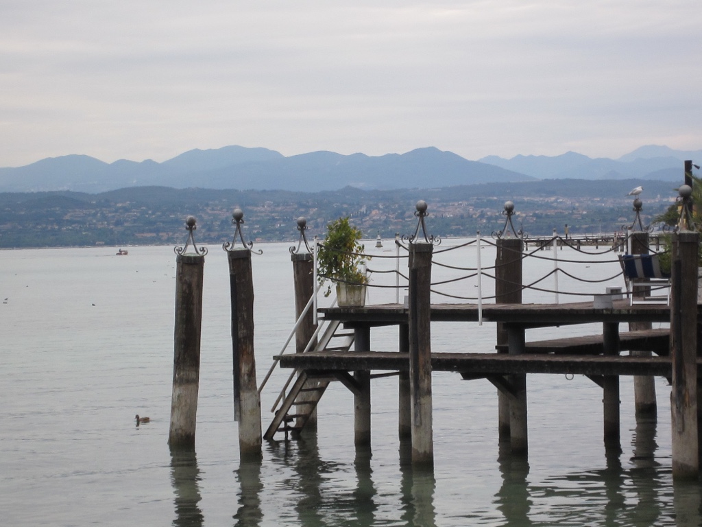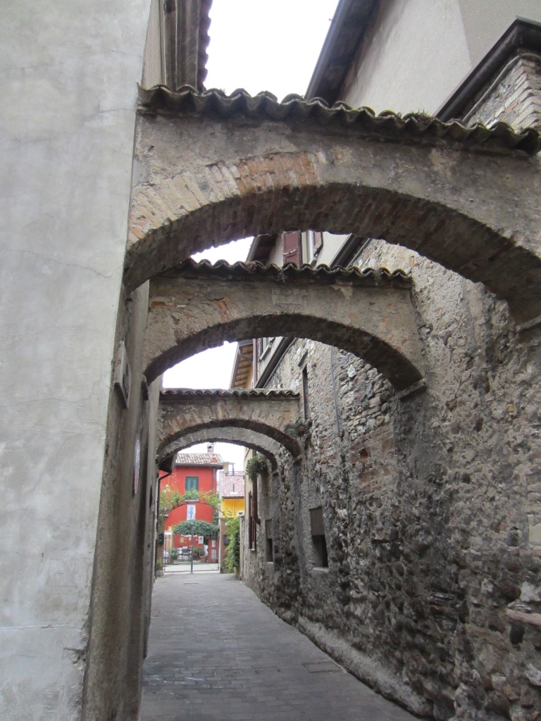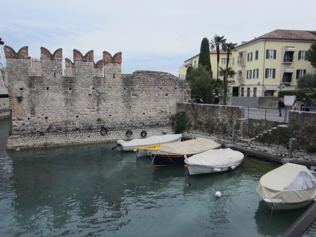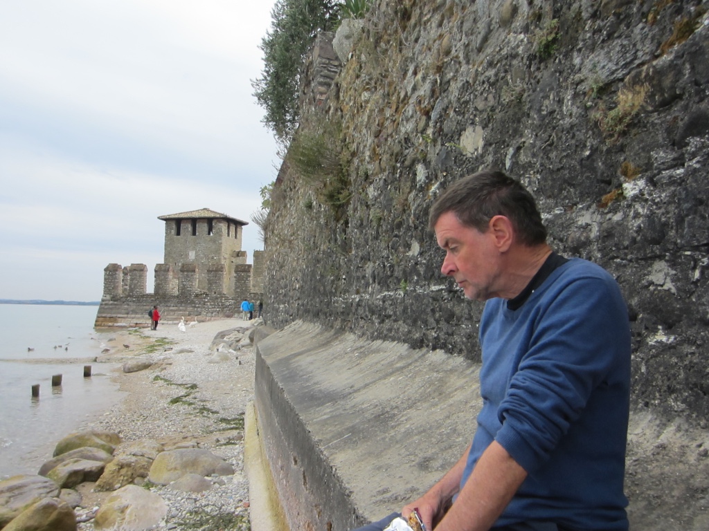 A packed lunch made and we cycled to Sirmione. It is at the end of a spit on the south side of the lake, which is not very attractive as both sides of the central road are hotel upon hotel. However, at the end there is a walled medieval castle with a small town: pretty winding streets and small squares. Very busy, cars, coaches and people every where. We ate our picnic sitting on boulders on the lake shore, until some swans came too close for comfort. Then we decided that an ice-cream for K was in order (daily quota) and then we finished our lunch off with 3 glasses of white each. We managed NOT to wobble on the return ride.