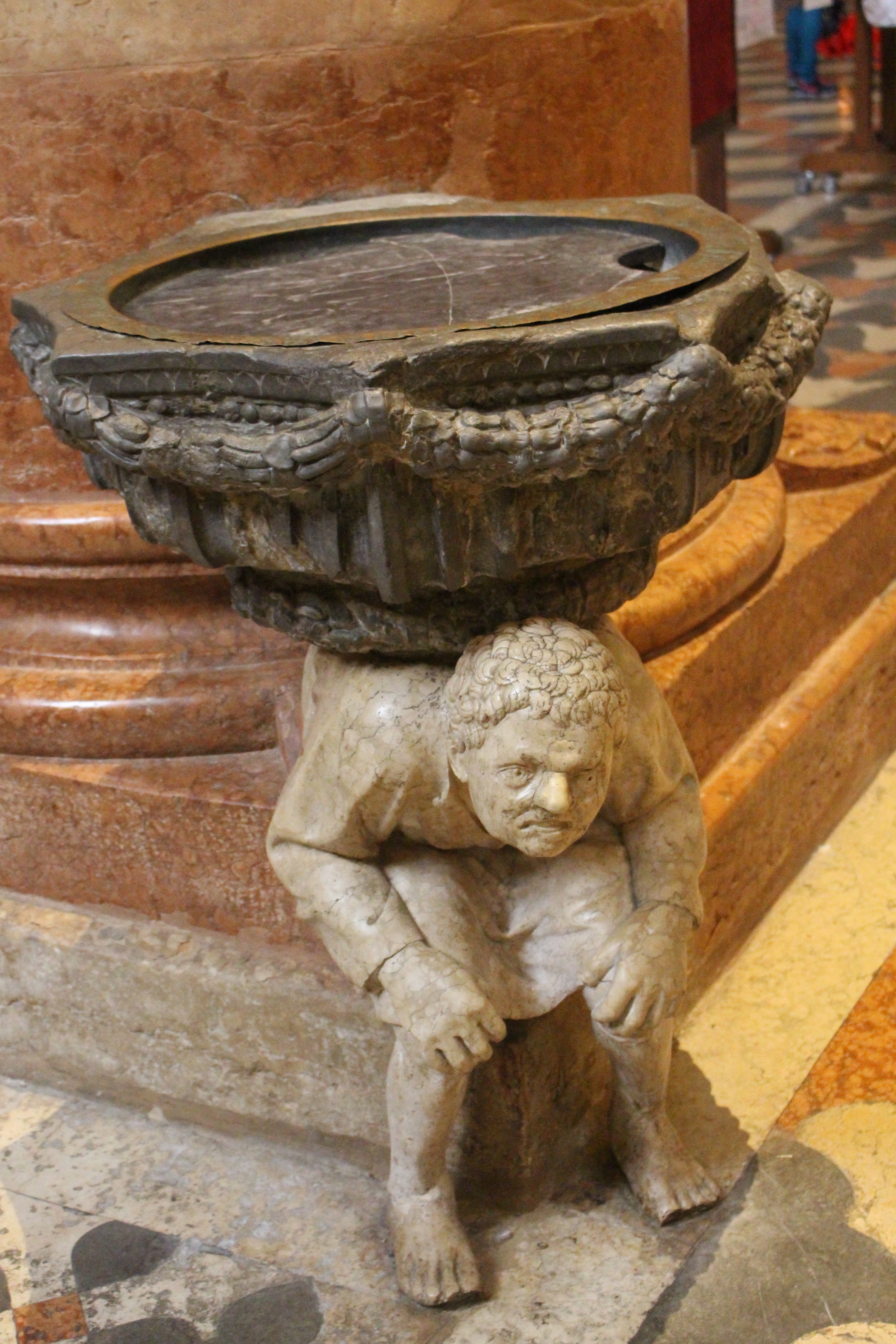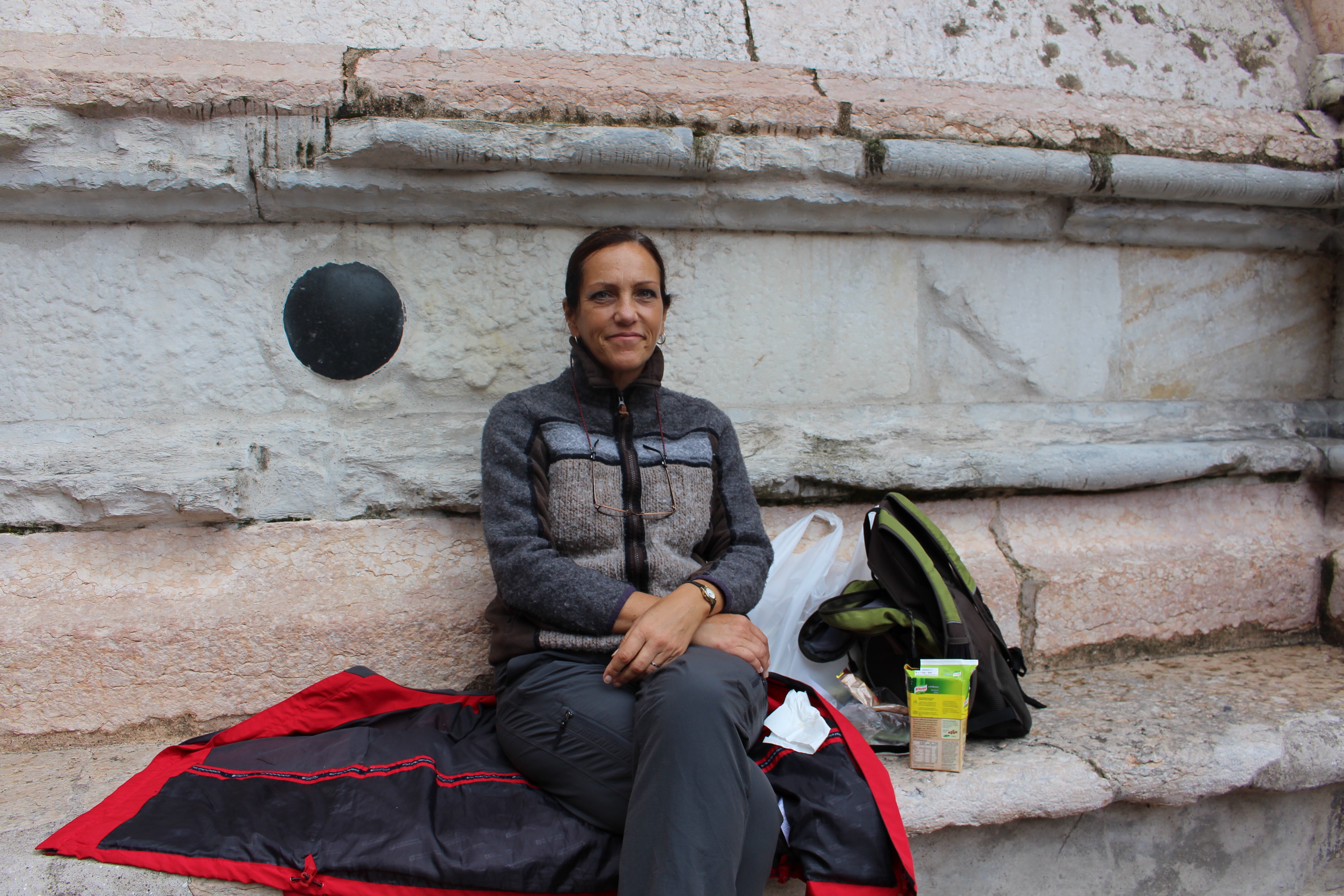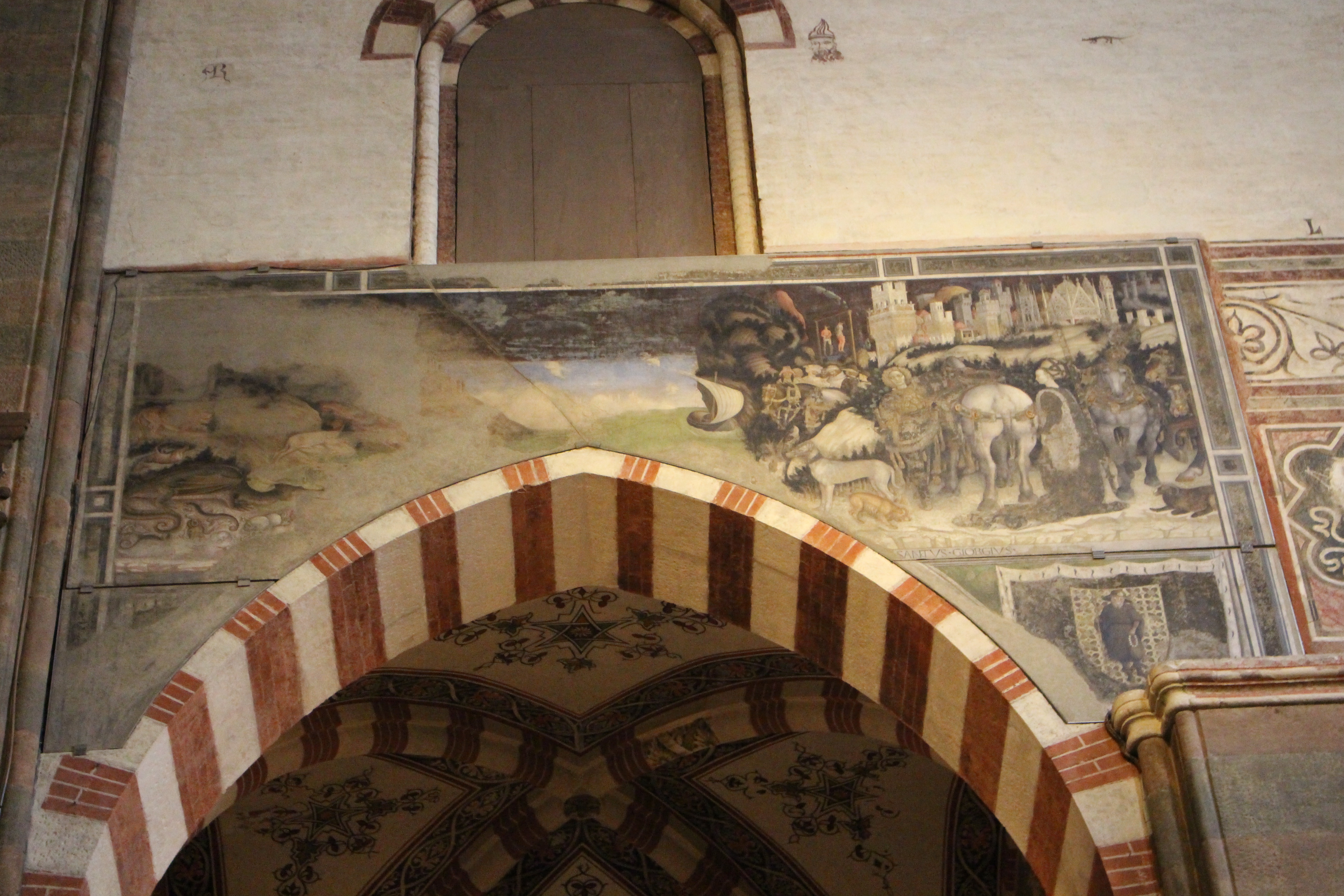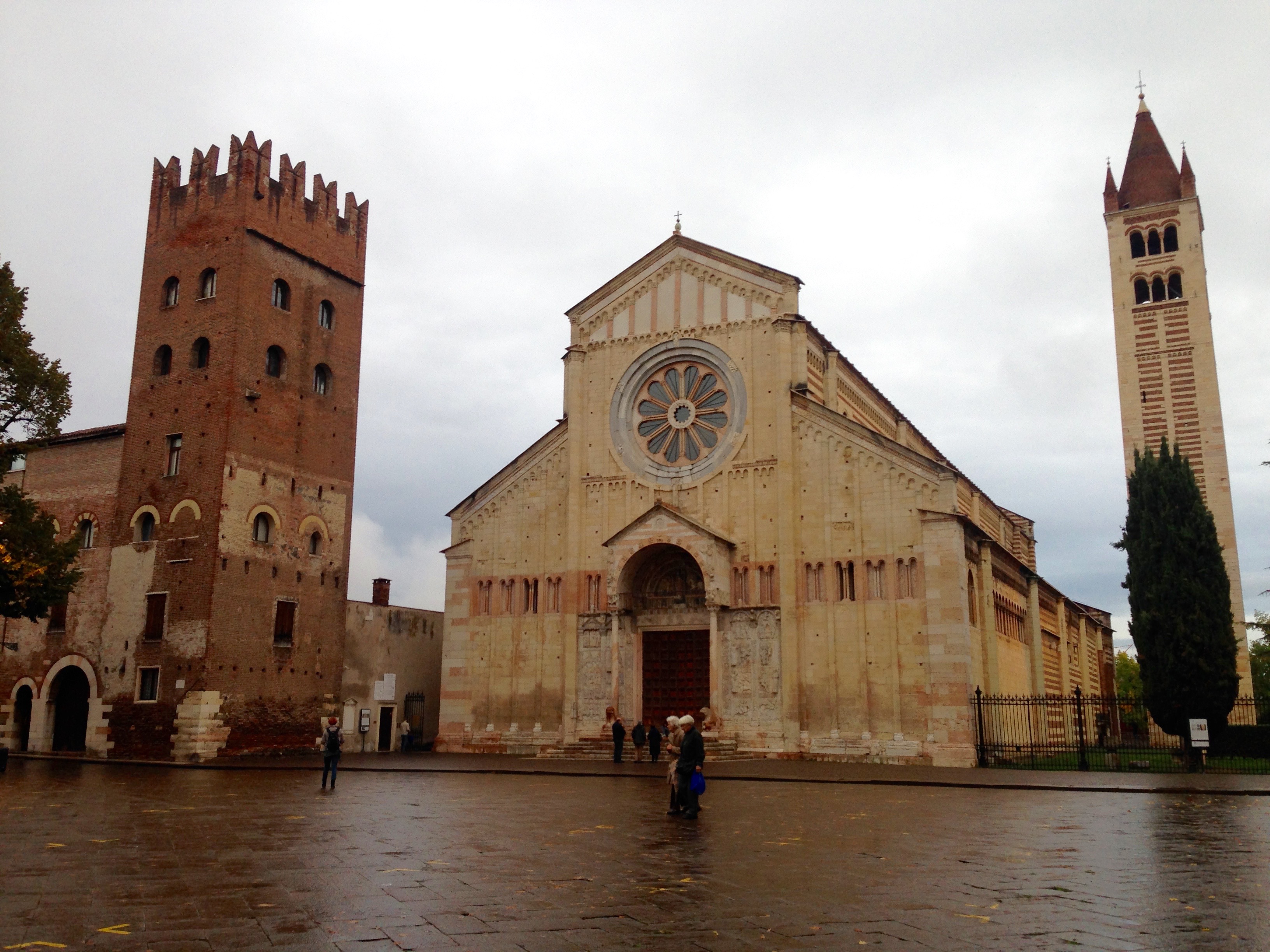 Italian Gothic, 14 and 15th century largest in Verona. A huge painted height with more frescos; the most important of which is Pisanello’s St George and the Princess, or what is left of it. We also liked the hunchback supporting the holy water stoop. Lunch stop outside.