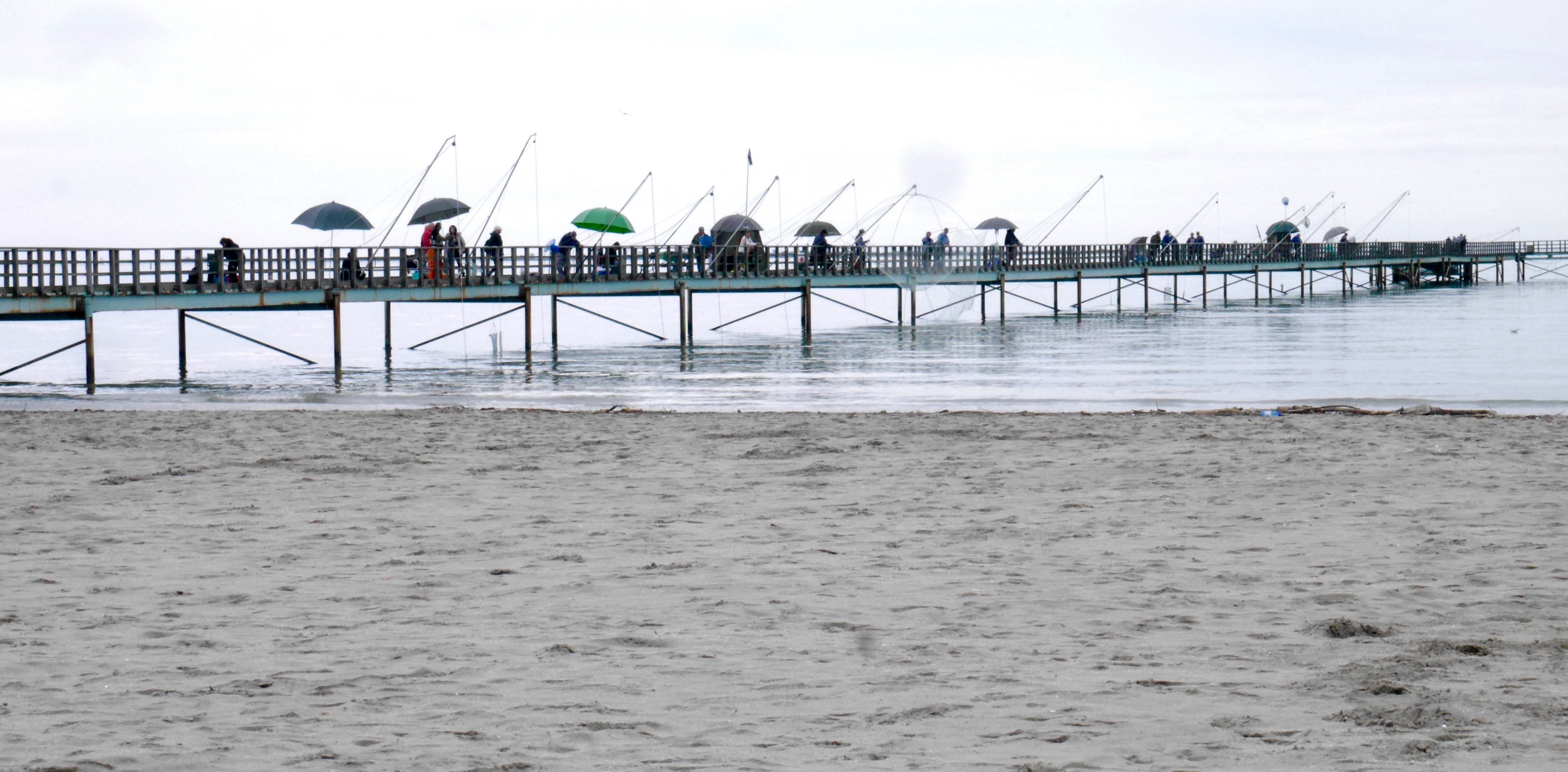 The beach at Lido di Voltano … a row of fishermen and the Adriatic around here is dead flat. The Lido is a rather shabby resort, not helped by the grey weather, but still a hot spot for the Italians … there were about 20 motorhomes all parked up.