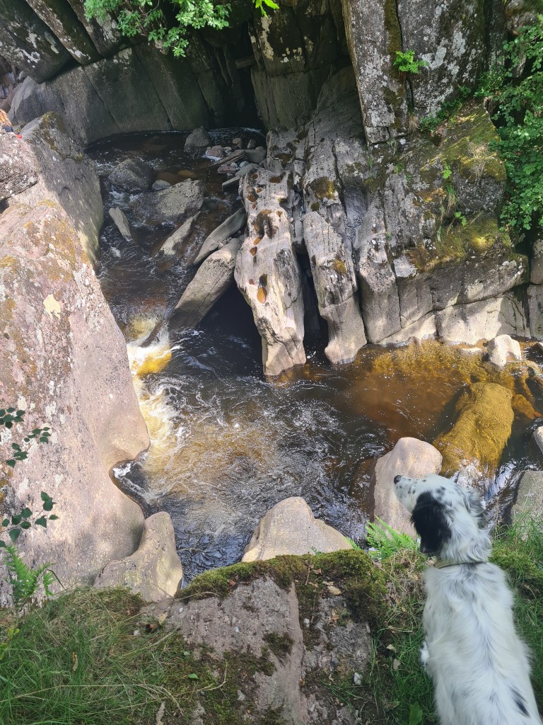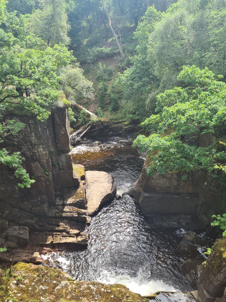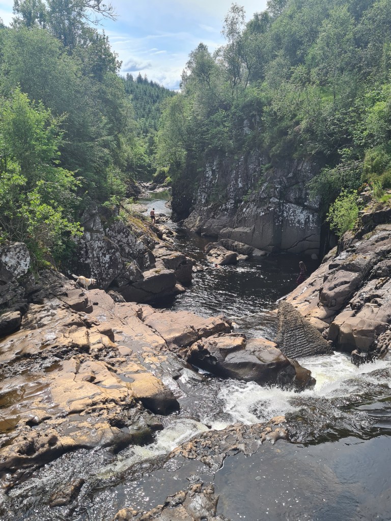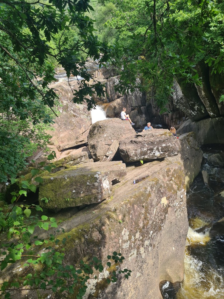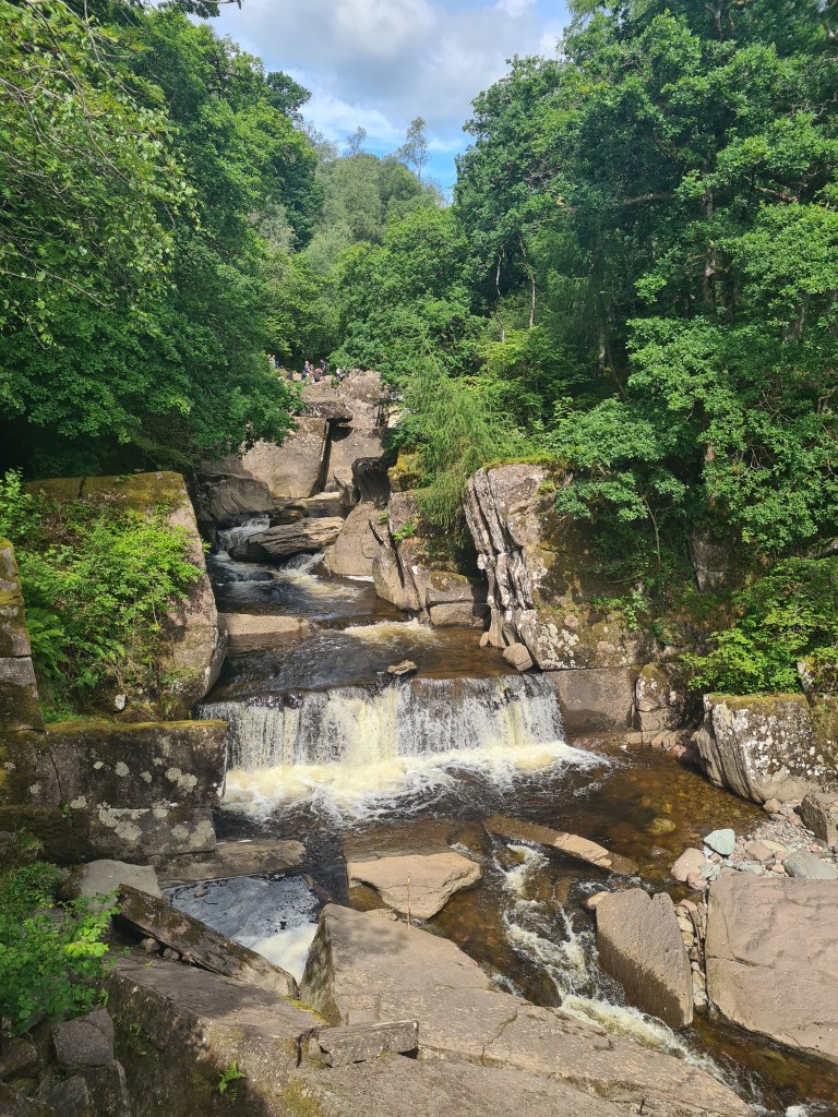We only had time for a shorter bike ride the next morning. Our bums were grateful. We headed up past the Falls of Lenny. J asked where we were stopping for coffee and cake … it seems to have become a daily feature! No cafes on our route today, I said! I was wrong. So coffee and brunch at a Forest Holidays cafe/shop. I googled … a 2 bed chalet is £2060 for a week in August! OK, so it has hot tub and BBQ, but even so, it’s still a shed! Our 3 double bed house in Devon is discounted to £1650 for a week in August and still several weeks vacancy.