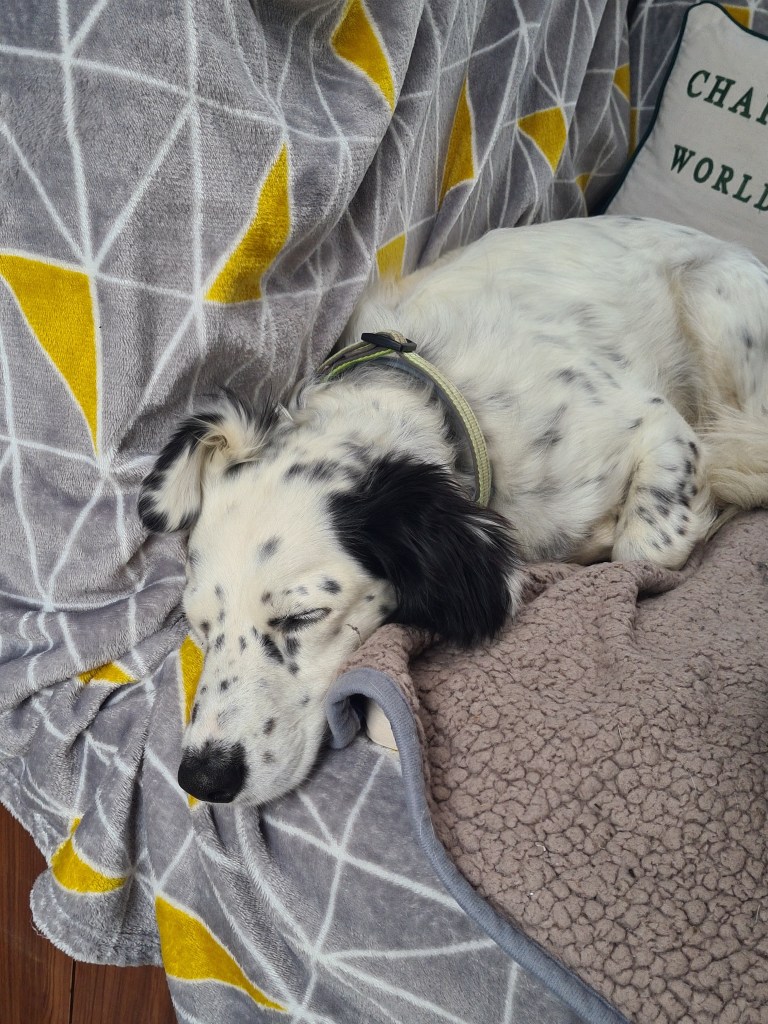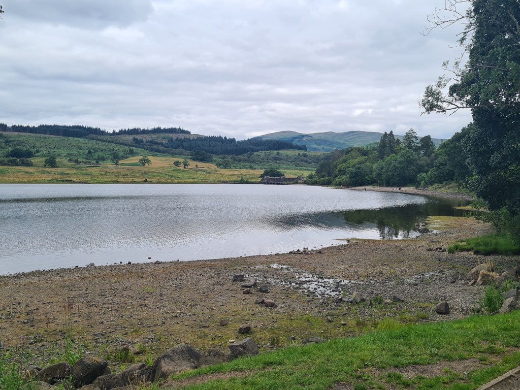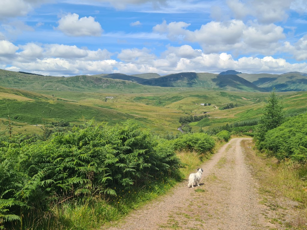 We’ve not cycled for over a year, other than my riding for 2km to the supermarket in Kelso! So bikes checked, and helmets worn. The first stretch around Loch Venachar was loose stones, up and down – nothing major but not fun. Our ebikes are big and heavy hybrids but not designed for proper off road. Additionally, the dog trailer doesn’t have brakes, affecting descents and especially descents with a turn. I’ve hit the deck a few times as a result. I asked J if he was enjoying it, not much either, so we dropped down to the road … easy peasey! Thereafter, we were on much better firm cycle or vehicle tracks. Except for one section through bushes to look at a dam.
