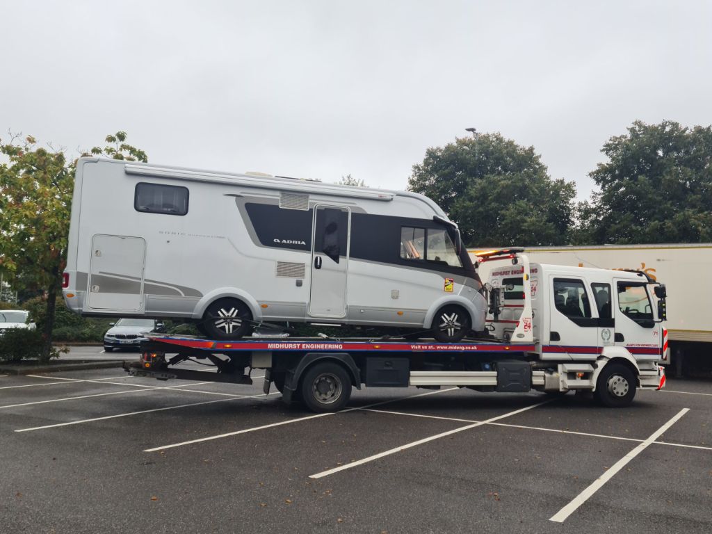 We waited 4 nights in Sainsburys car park for a low loader! At least wine and ice cream readily on hand. By day 3, after hourly phone calls, we had been escalated to the insurance company’s nominated repairer’s Techical Manager. Rick is a man with a brain who uses it. There is no point taking the moho to the standard car repair place in Portsmouth. And no point calling a low loader until a specialist repairer could be found. Greenfields in Camberley thought they might affect a repair until they saw it. At this point, Rick was talking a right off. We were totally belly punched.