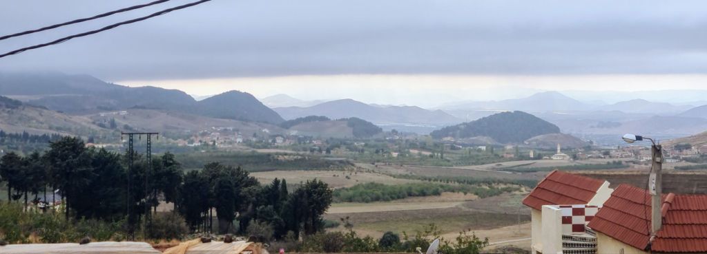 We drove up to the Middle Atlas. Leaving sunshine and my shorts behind. To fog and some rain. J still in shorts! Shopped at Mr Bricolage to buy some nylon rope to replace chewed and knotted guy ropes, damage courtesy of one of the campsite dogs.