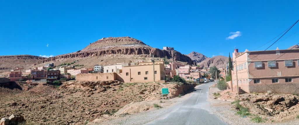 It was actually a main road, and we headed up, intending to drive to the next town 26km away for lunch. The road got slower and slower as the surface got worse and worse. At that rate, it would have been dinner time before we ate. And I’d promised Brian salmon fish cakes. About turn. Found a good place for lunch. And into Tinghir for a little shopping in the main dirt track street.