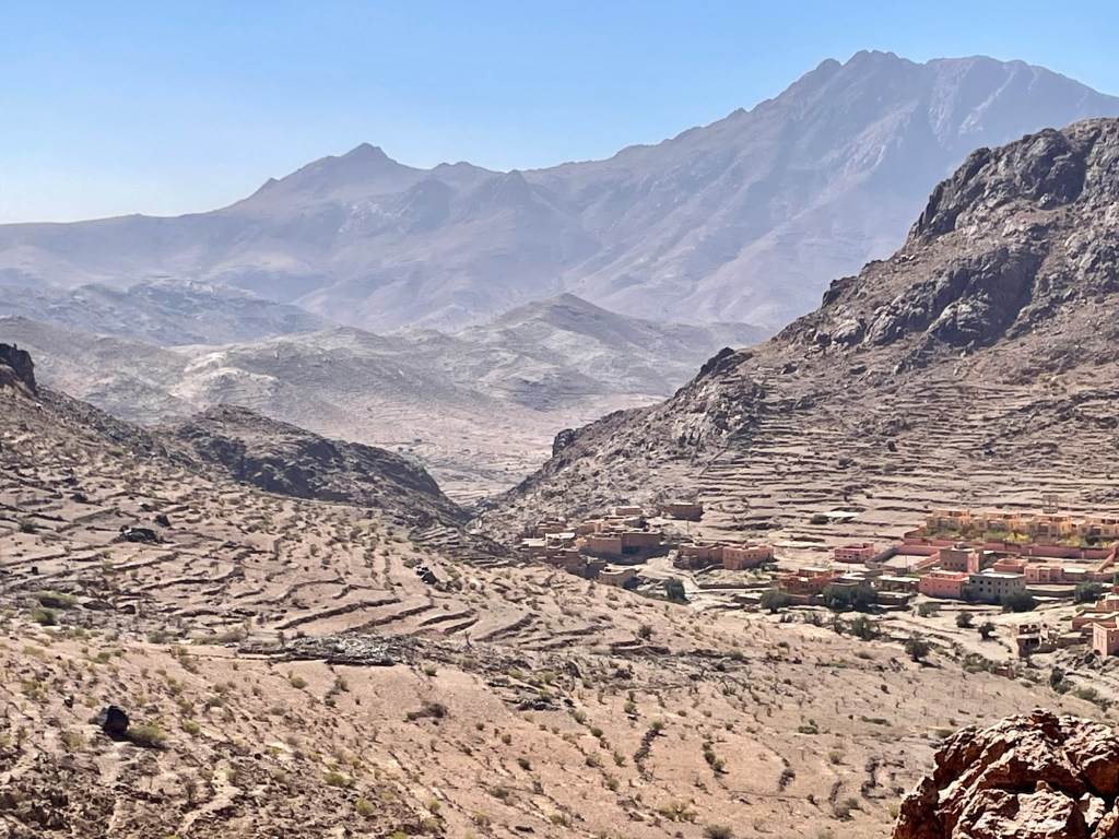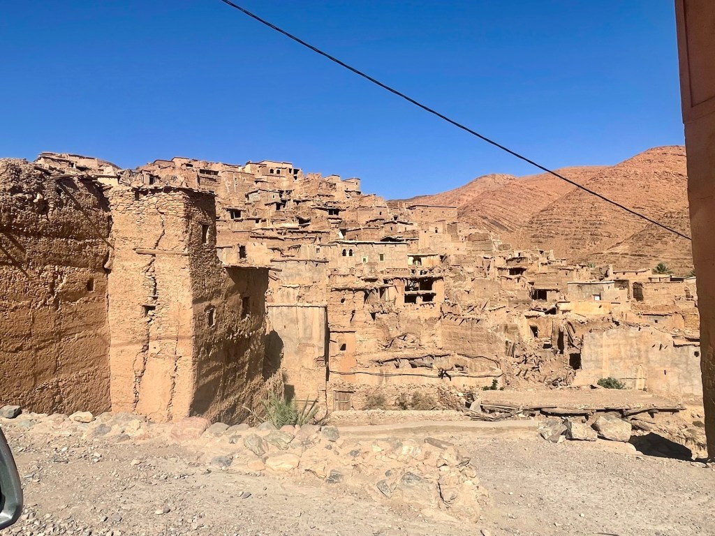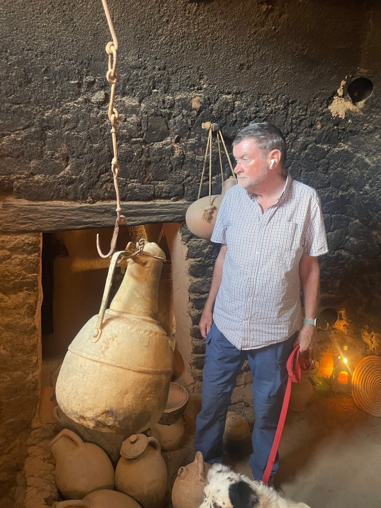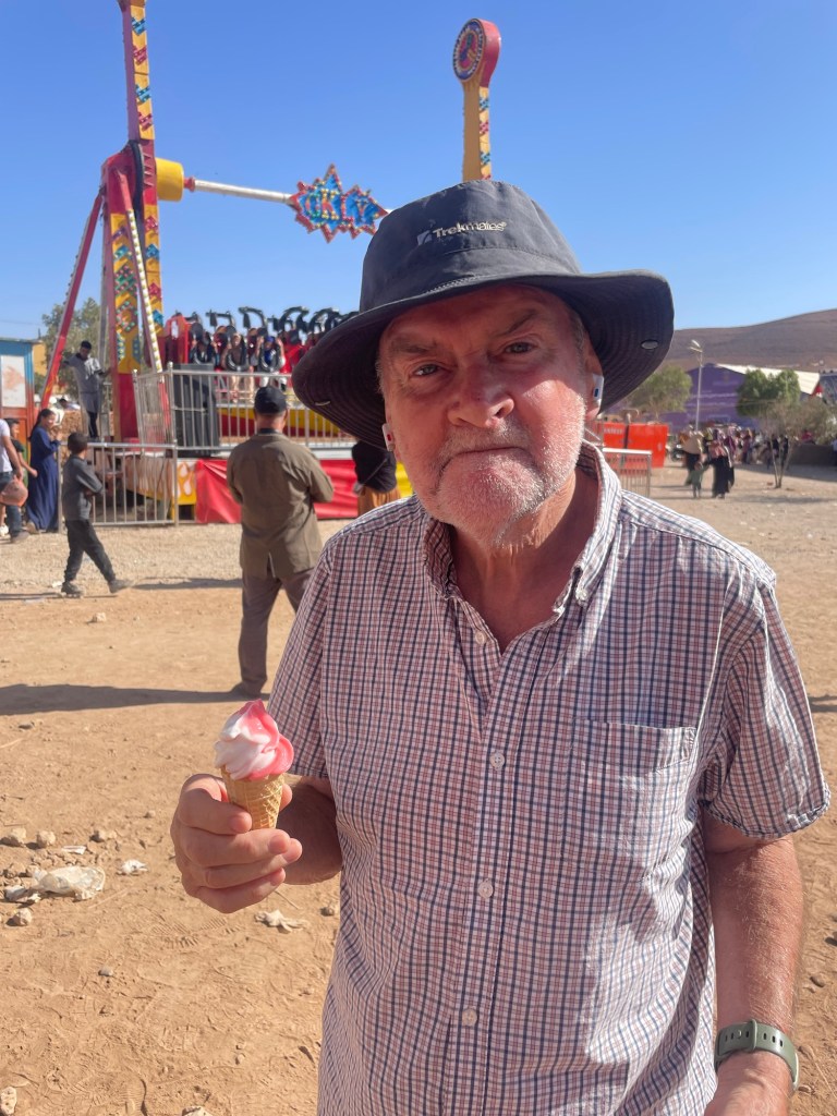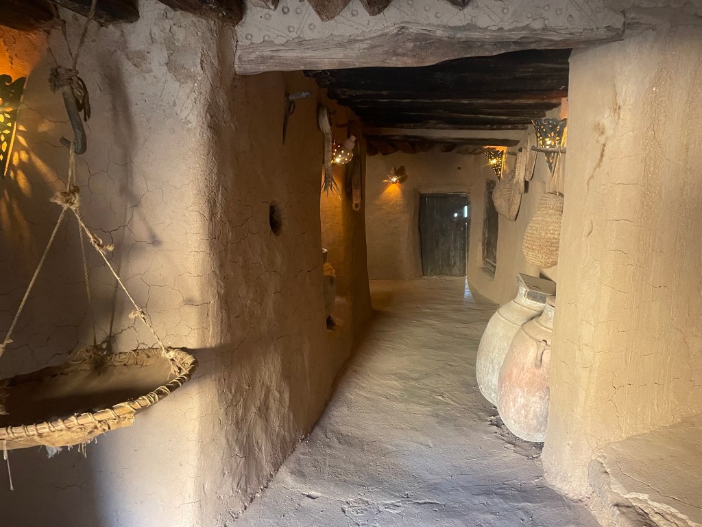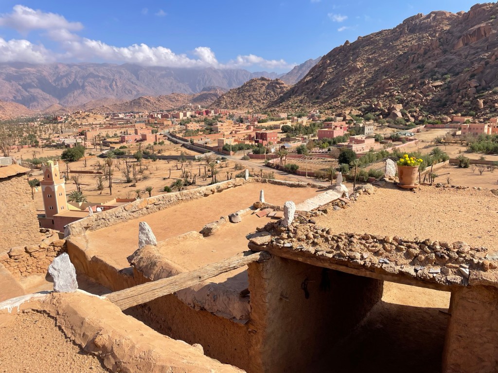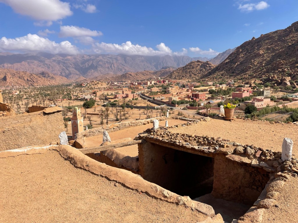 We drove a short way out of town to a Berber house museum. This was most informative – the guide had lived there as a child. Three families still live there in the summer but mostly live away to earn a living – due to climate change almost nothing grows in a previously rich land – massive water shortage. In September there was heavy flooding in many areas. Here they had just 10 mins of rain. The first rain this year! Water is piped down from the mountains / oasis we saw yesterday. As a lad, our host explained that water was plentiful for daily washing, crop irrigation etc. A government minister wanted to make the area into a joint protectorate but some of the families fought and the project died. No funding available.