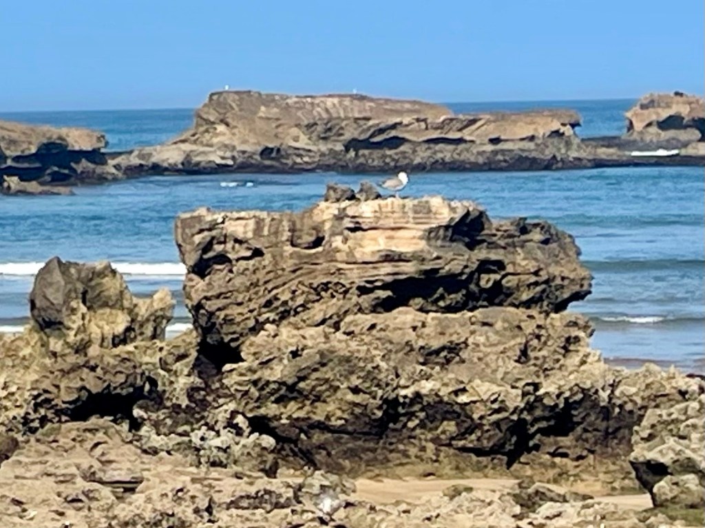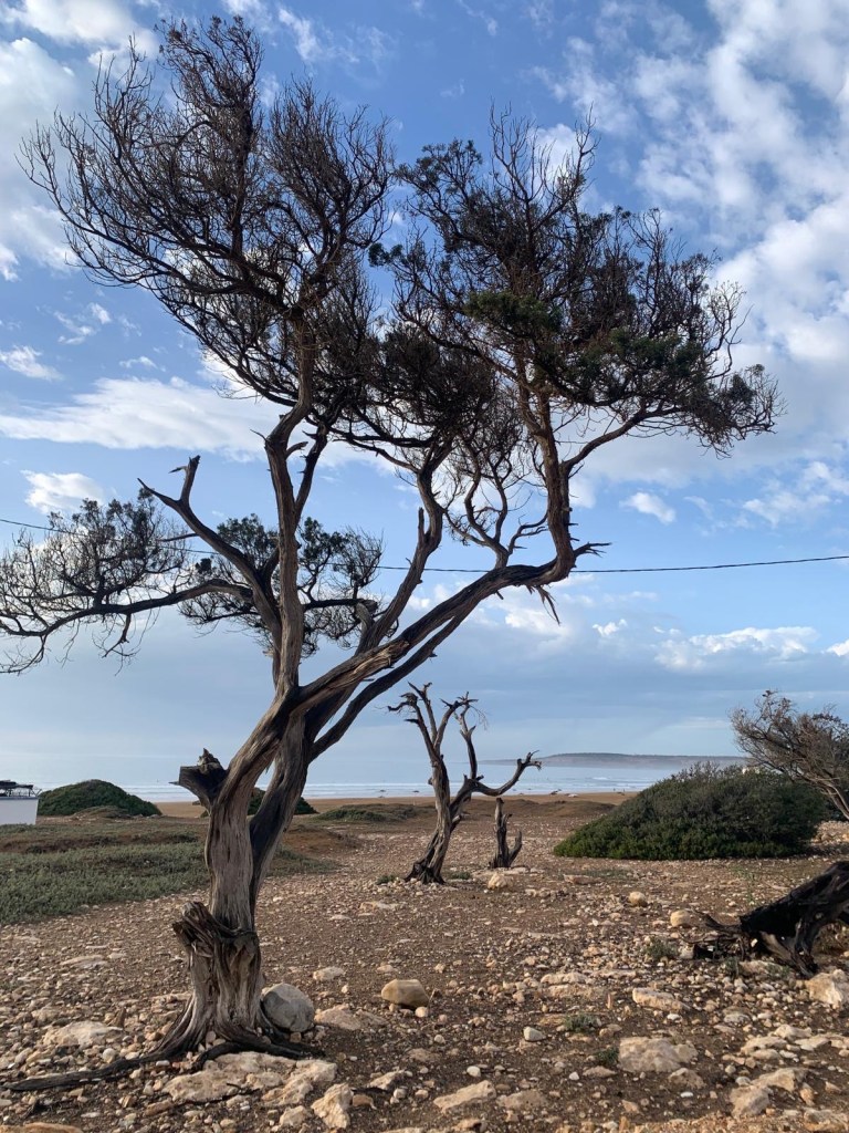 Tent down and on the road in good time – after a few hours we arrived at a very smart apartment in Oualidia. A good walk to the nearby lagoon – a very green area in spite of the water shortage. Stopped for a drink at the local taverna but they didn’t really understand us so we walked on – gin o’clock at the apartment.