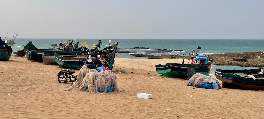 On to Sidi Kaouki. Recommend Camping le Soleil by a few folk. The owner seemed surprised we had a tent, which we managed to erect largely between showers. And the pegs went in due to the day’s rain. Walk on the beach and gin o’clock.