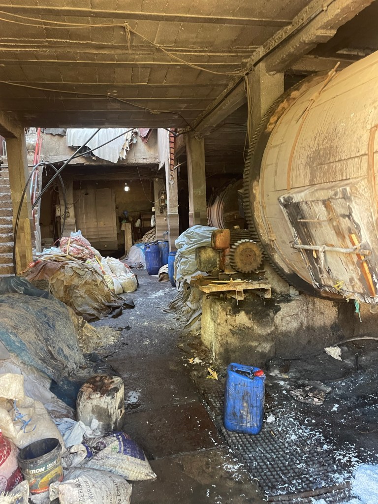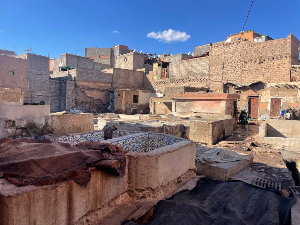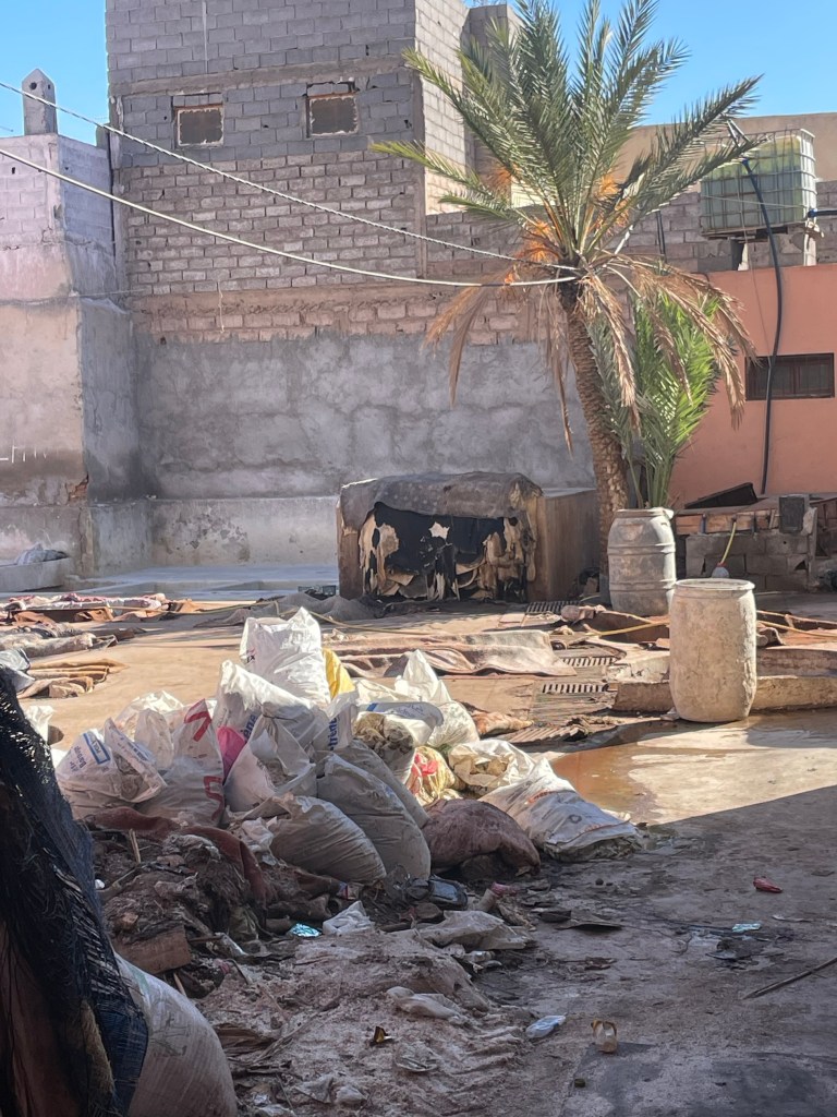 We wove our way to the tanneries. A self appointed guide explained that the small tanneries were right for Arab but left for Berber. Not sure about this, but he did guide us to the main cooperative. We could see men cleaning the hides and the carpet covered dying pits.