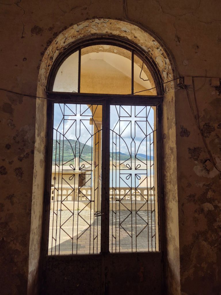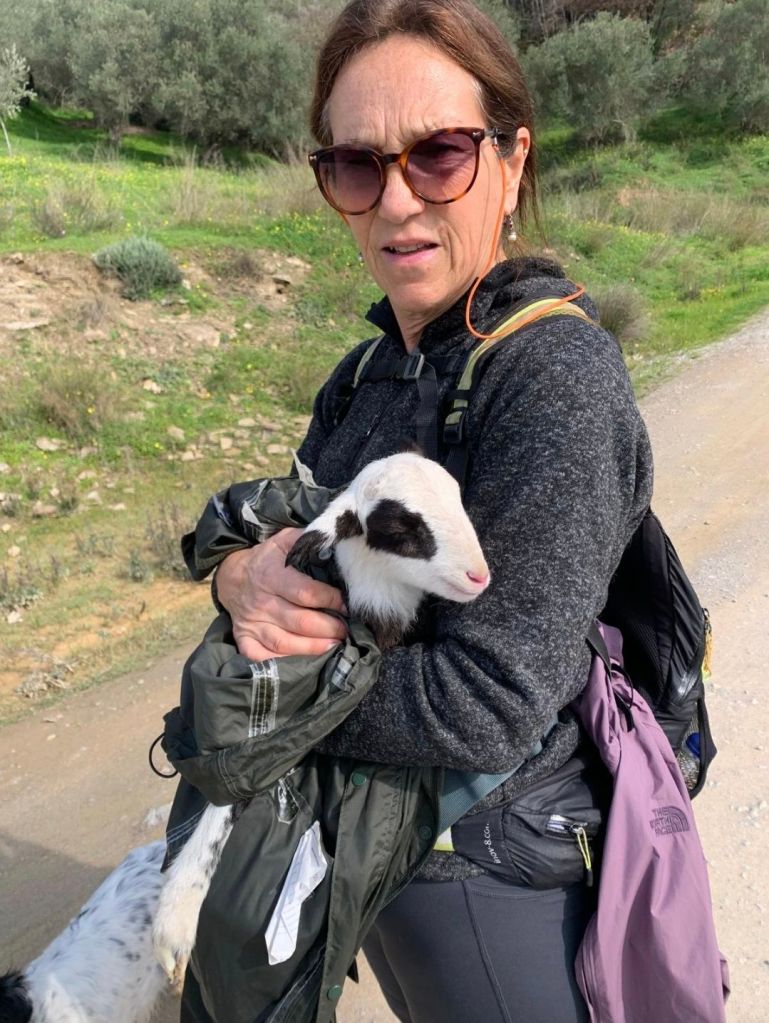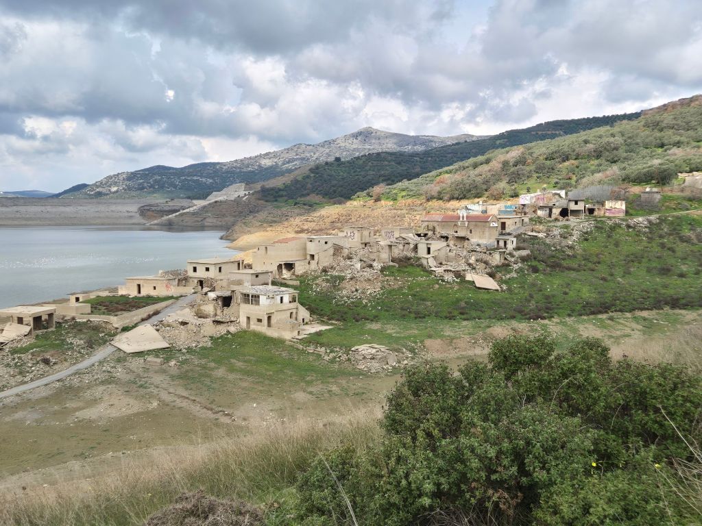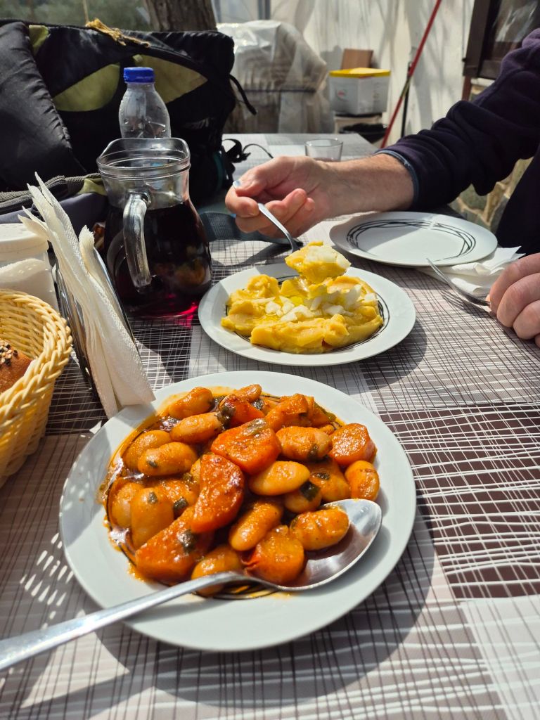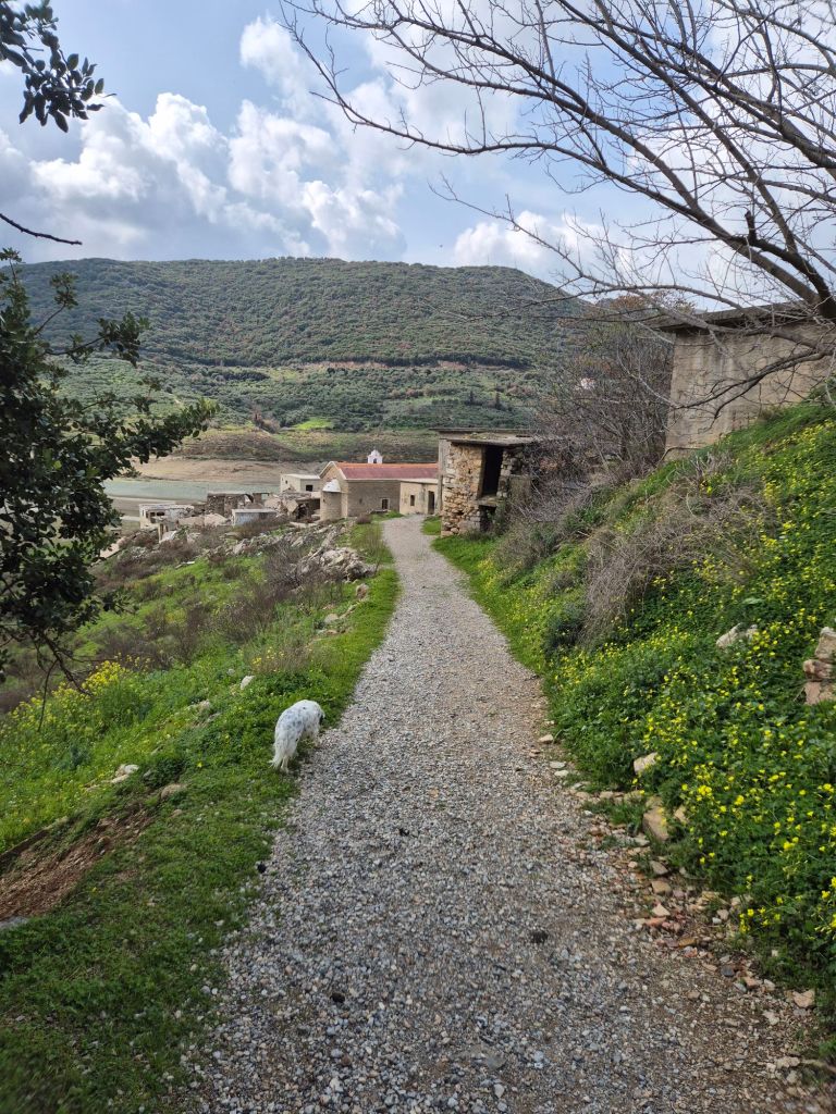 We left our gorge overnight location and walked the 1km to the village – through and headed for the barragem. About 3km on the road – we heard a sheep’s cry ! A newly born lamb appeared with its umbilical cord. It stuck to us and was obviously hungry – would not take water. We decided to take it back to the village and look for someone to help. A shepherd we spoke to said he might know the lambs flock and took it from us. With a “efharisto,” we turned back on the road to the reservoir and deserted village… The reservoir was almost empty, and the village was high and dry. We took a shorter road back to the village. It was “clean Monday” – the precursor to Lent in Greece – the taverna beckoned – wine appeared as if by magic! We managed to consume a half kilo with crisps… a further vino jug was brought with lunch – the road back to the van took no time.