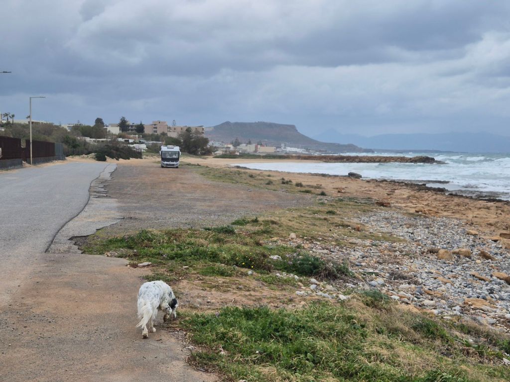 We directed our van to Gouves on the seafront via some sharp twists and turns – to a beach wild camping place – it’s lovely to camp and hear the waves. Eggy lunch – I napped and K walked C. Then we sought a cafe for coffee and biscuits – not vino! Back via the beach to chill for the evening….