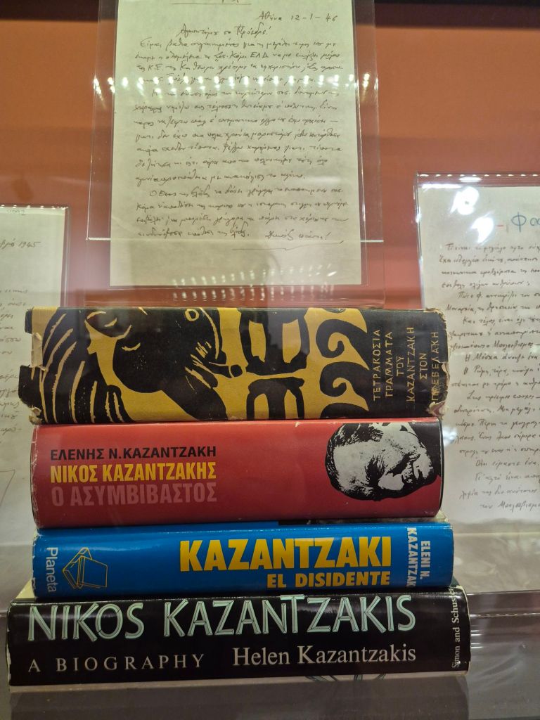 Meeting Zorba the Greek, well his author. Well, to be really truthful, not the author himself as he’s long since deceased. The museum is dedicated to him. Nikos Kazantzakis was recommended to us after James recently gave a talk on James Joyce. Both reacted to the restrictions and controls dictated by the Church, lived for years with their lovers before marrying and travelled. But actually, I thought Kazantzakis is Joyce on steroids. He travelled and lived in many countries worldwide, studied religions, held government offices, had books placed on the Vatican banned list … and had 2 long term lovers whom he finally married (not concurrently!). I’ve just started Zorba the Greek audio book. Stunning descriptions and use of language.