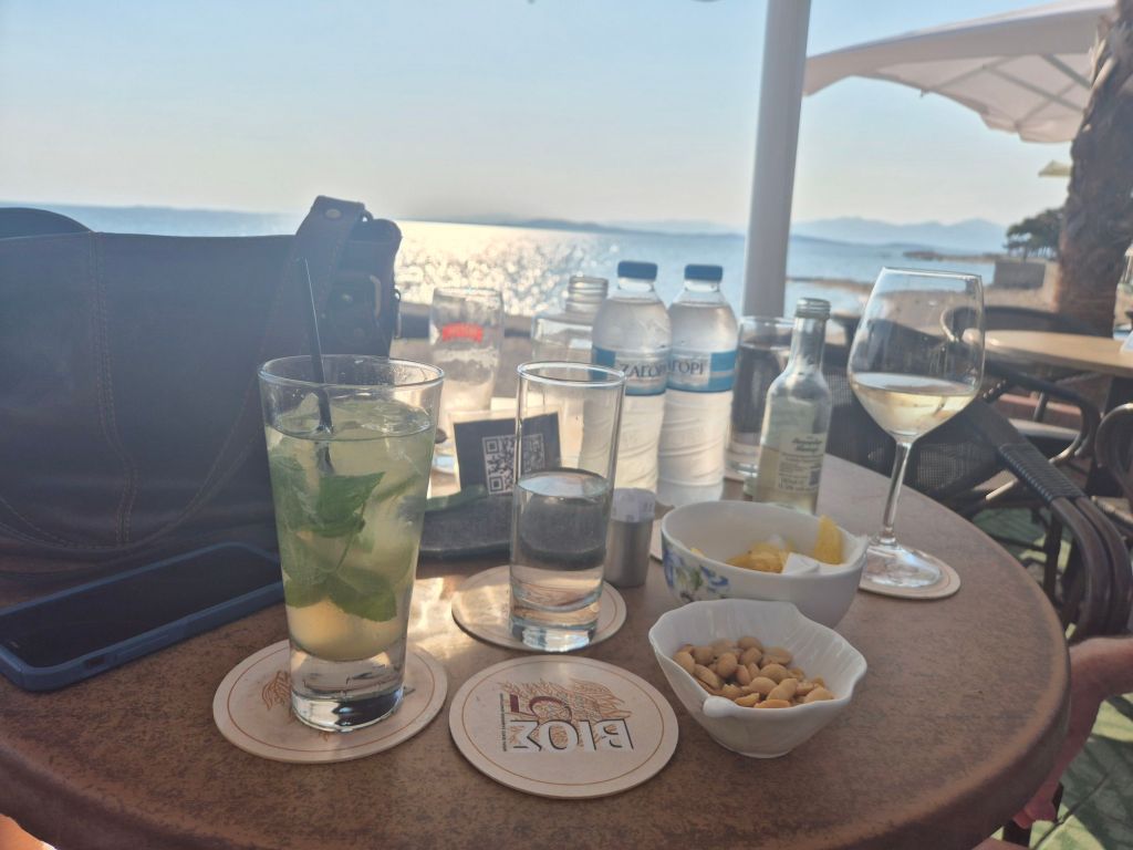 With temperatures at 36C, we sat in the shade. The owner kindly did a coffee and pastry run (with lack of fridge, we’d no food and hadn’t passed any cafes on the way from the port).