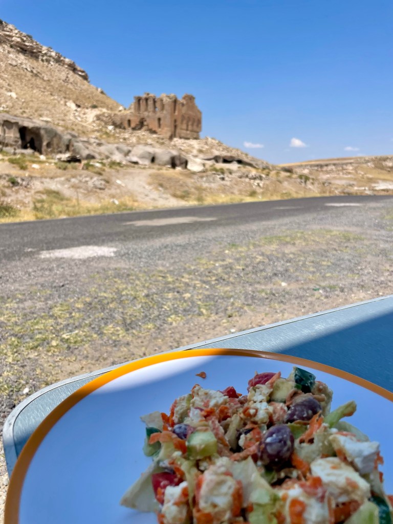 A short drive away was Asikli Hoyuk. Much older than all the caves. 100,000 years ago this was a farming settlement of several families. 25 generations of them. Not a lot to see but worth the stop. And free! Not that we’re always cheapskates!