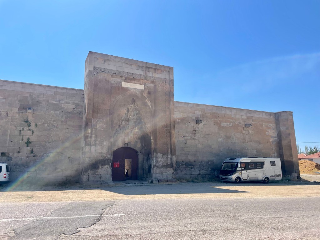 The Agzikarahan Caravanserai had an impressive portal; theft was prevalent on trade routes. An indoor area with a mostly intact roof … just the dome missing. And an outdoor courtyard with a mosque on legs. <£1 entry.