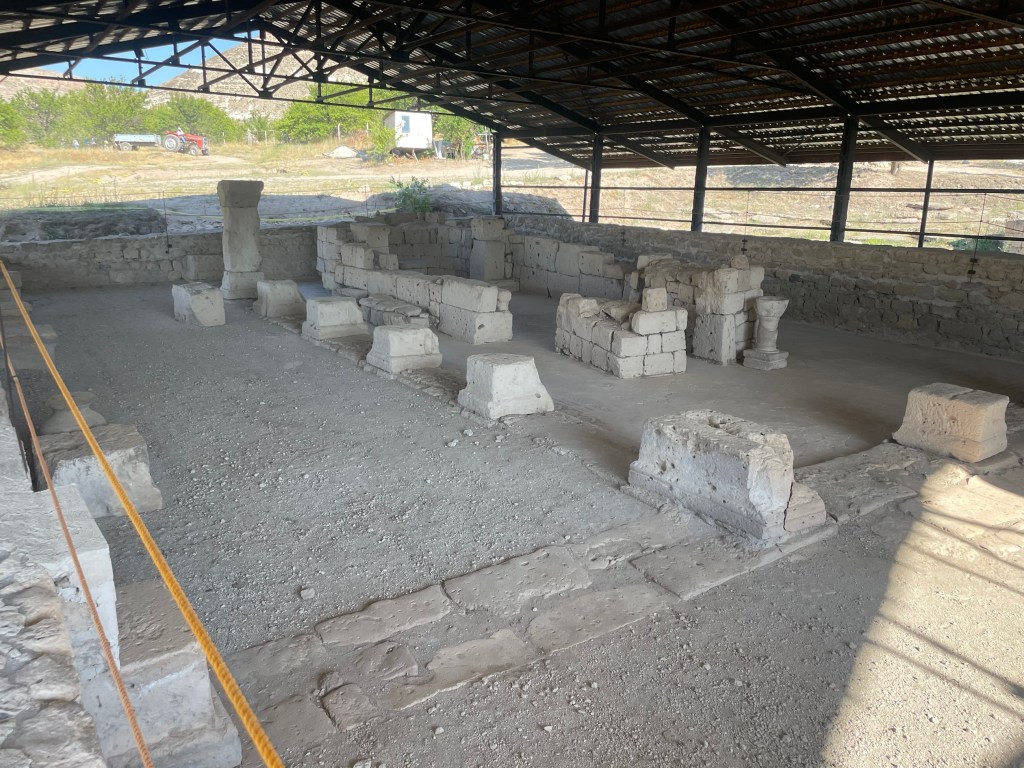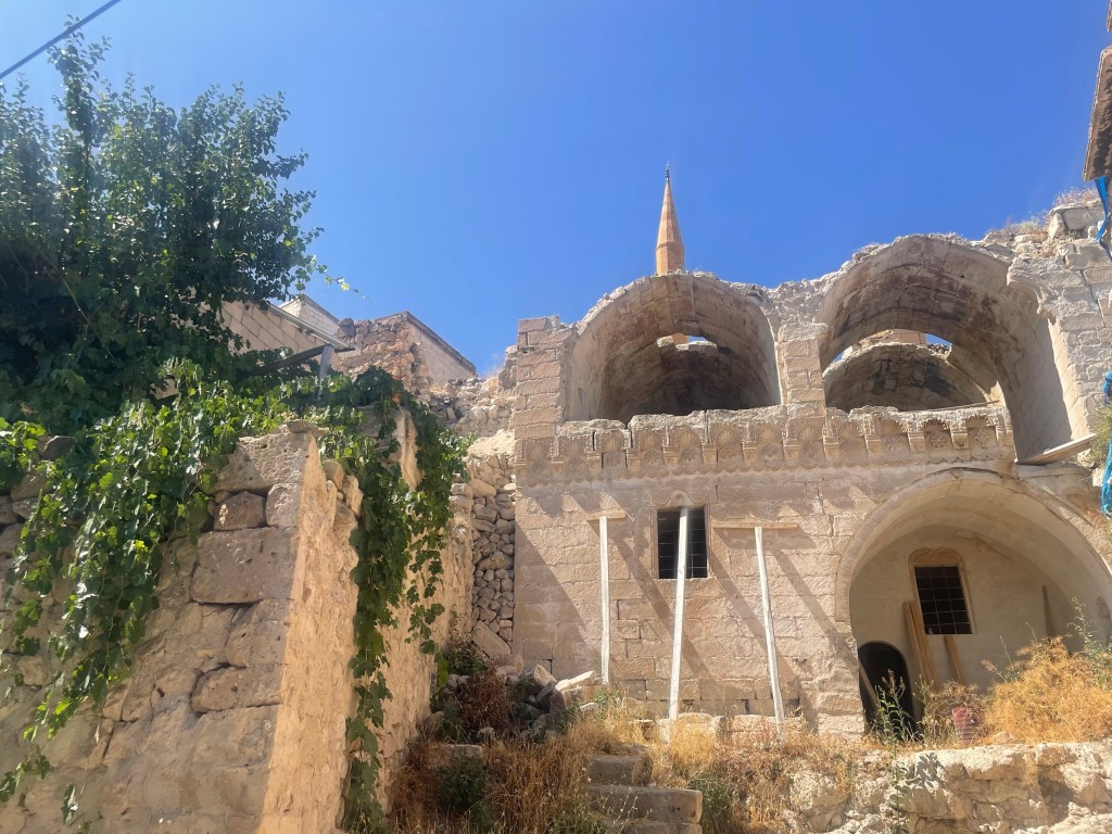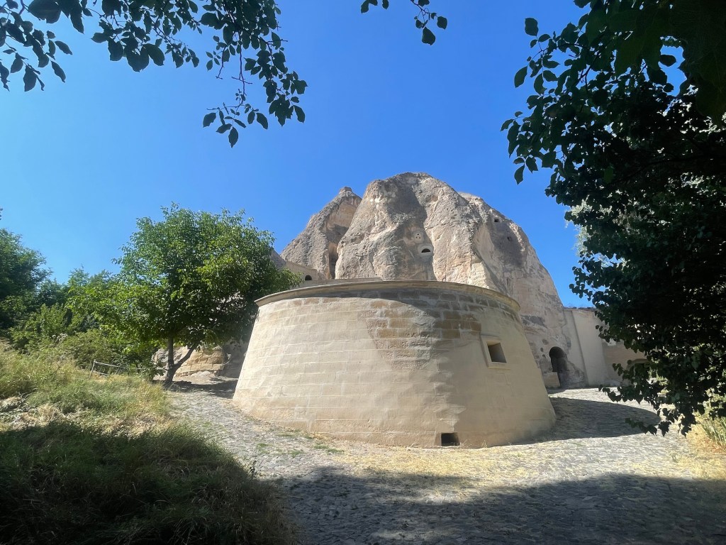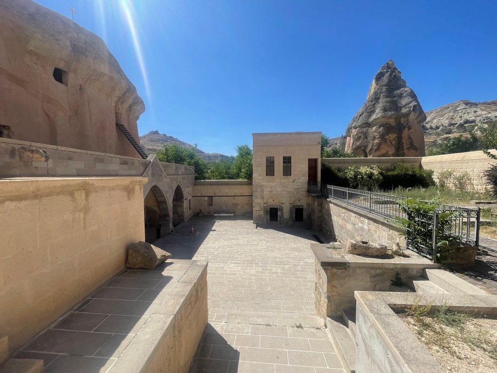 The medresa (Islamic School) and now part of the Kapodokya University, has a fine portal. With 2 columns that are supposed to turn if an earthquake is coming. One end is definitely fixed. I checked.