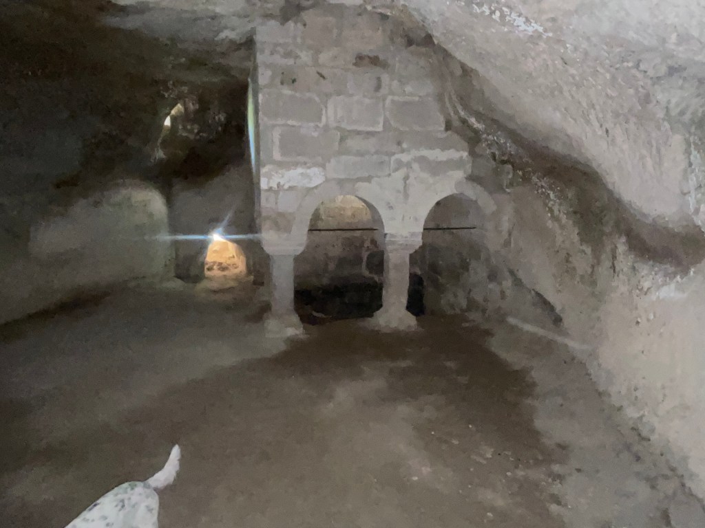 We walked to the monastery which is being regenerated. One of the workers opened the gate. Stone front. Rock behind and rock refectory etc.
