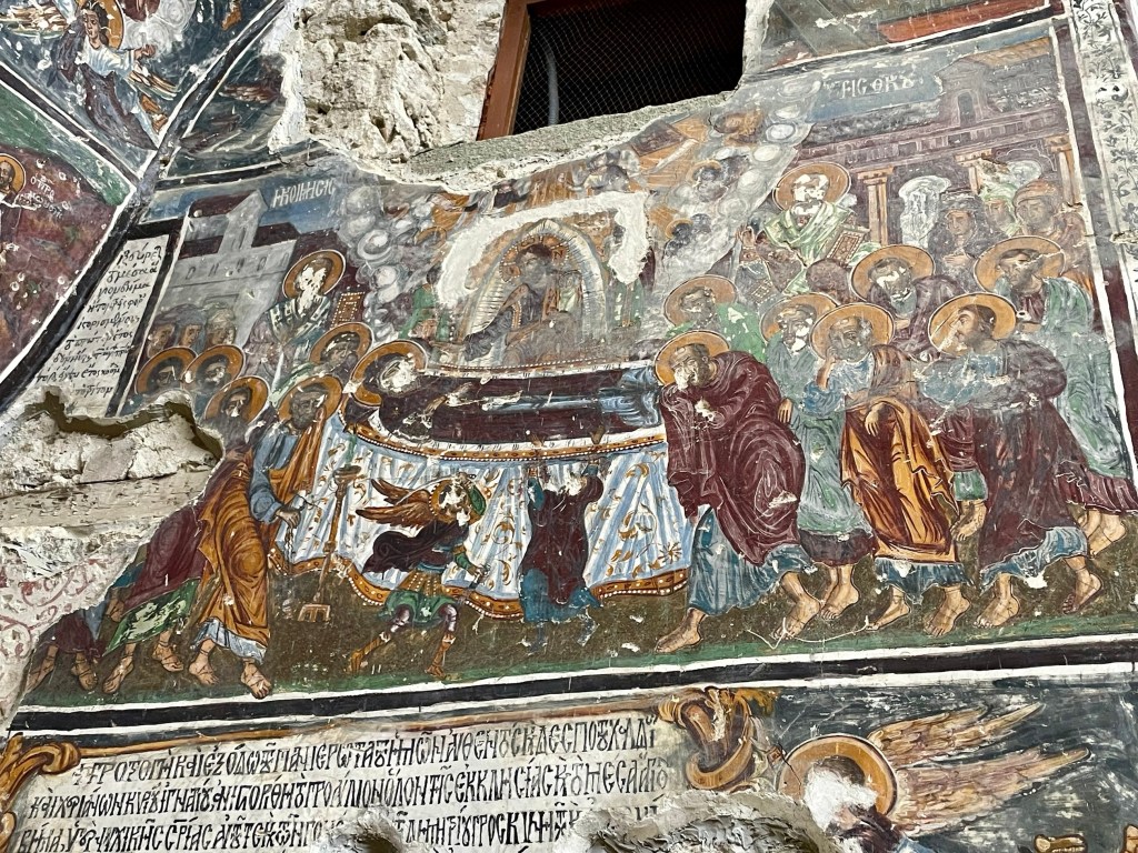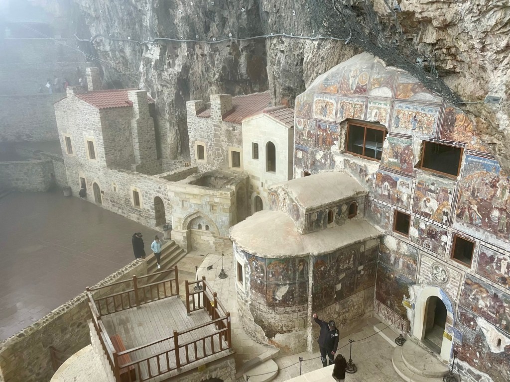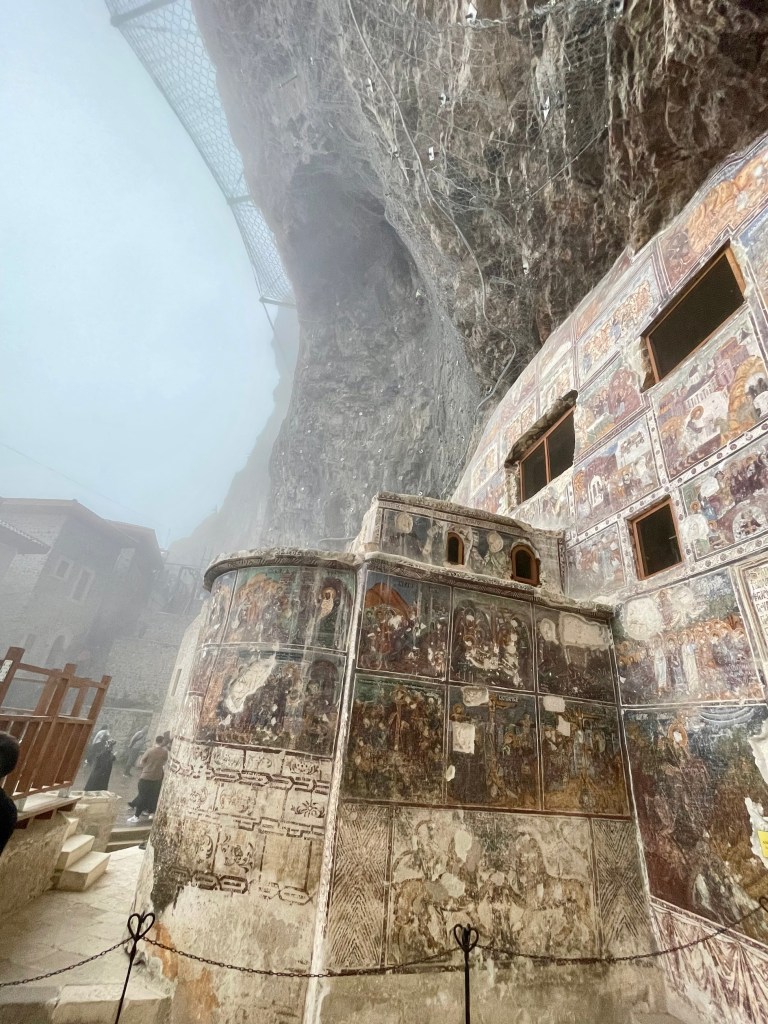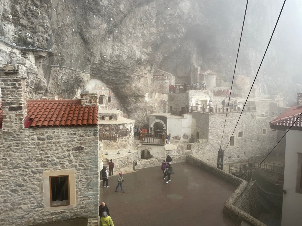 Our destination was one of the top attractions – Sumela Monastery. A Greek Orthodox monastery built into sheer cliffs. Originally founded around AD386, largely expanded during C6 and C13. It had 72 rooms including a rock church and various other chapels. It thrived and was a pilgrimage site until the population exchange in 1923. Thereafter it fell into disrepair, with a fire destroying wooden parts in 1930. The Turkish government funded restoration with it opening to visitors in 2011. It then had to close from 2015-2019 whilst they installed significant measures, including steel netting, to prevent rock fall.
