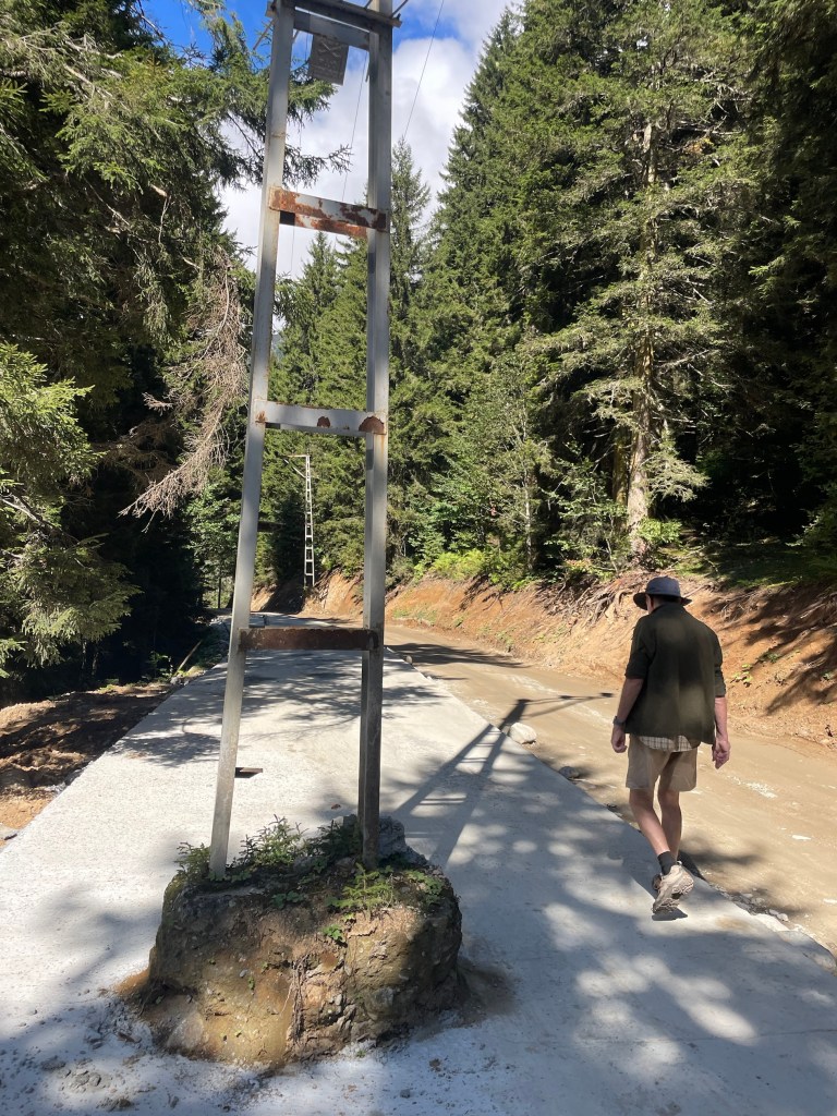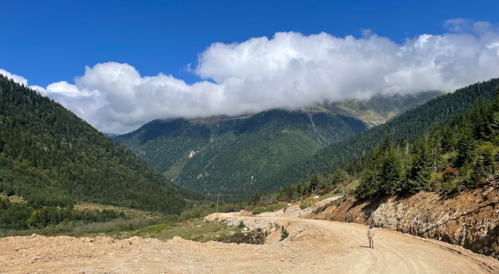 The rain arrived at 0600, and rather than get stuck in mud in our lay-by, we drove / crawled up a dodgy road to a camper stop. It is / was being constructed and then was destroyed by an avalanche. Some derelict huts, a lot of new roofs and even more piles of broken timber and bent metal. Very sad when folk invest and try to make a living. We felt we needed to contribute so left a good tip after a shared lunch plate.