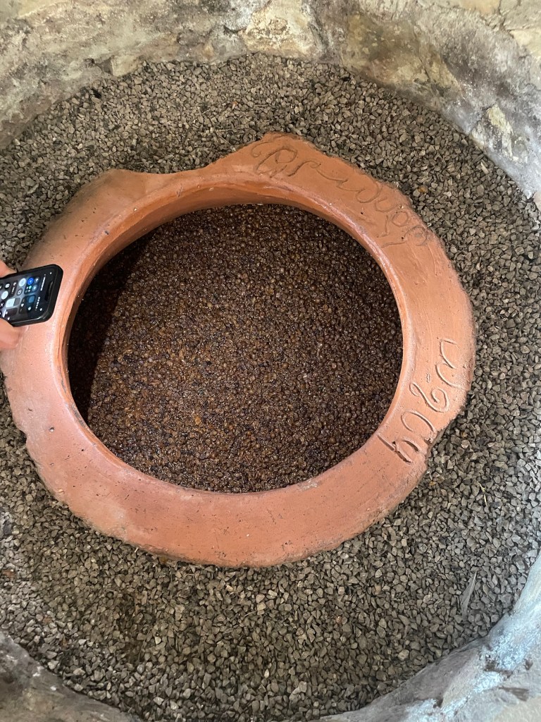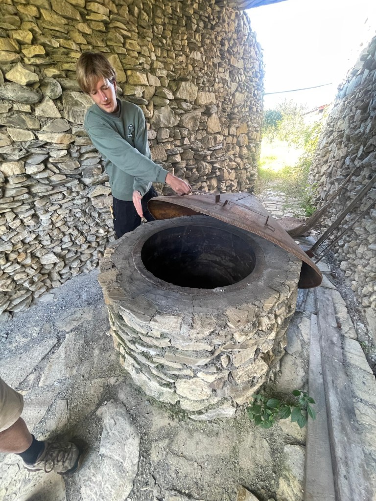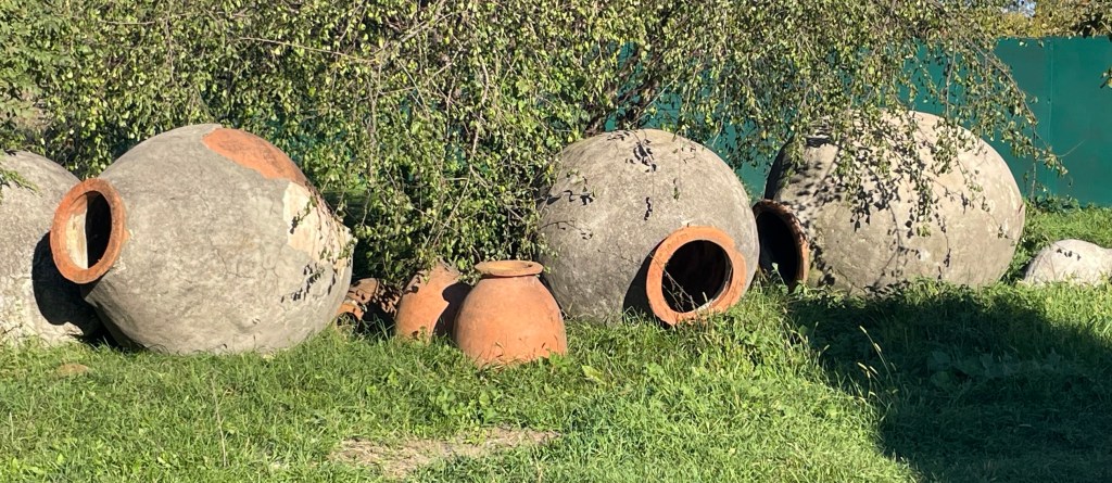 We had a tour of Temi Community this morning with Jonas, German, working here for a year. They have their own bakery, using largely home grown indigenous wheat. Poly tunnel for veggies. Fruit and nut trees. And, of course, vines. 3 varieties producing 3-4 wines. 4000 litre qvevri. Grapes have to stay in them for min 6 months to obtain qvevri label. Organic. No additives. No added yeast or sulphates. White is quite yellow. Distinctive.