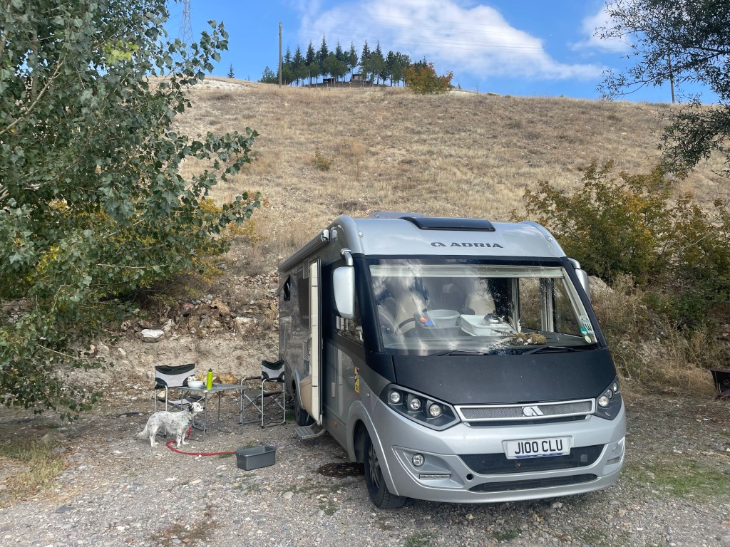 Up early, walk around the lake and services done. The 65k back south to Ankara. We were 6 hours at the air suspension place. But they had to identify the problem and buy parts. Fortunately not the same air bag leaking. It was the inlet to the bellows (Google translate). We walked to the nearby shops. Had coffee. Walked Corrie around a park. Took out another wedge of cash not knowing what the bill would be. Paying 20% extra is a plastic card deterrent. I knitted and caught up on Strictly. J napped and read. It was a long 6 hours. We had thought we would need to go to Zampatas Brothers in Thessaloniki, as they are a Goldschmidt agent, but now we need not.