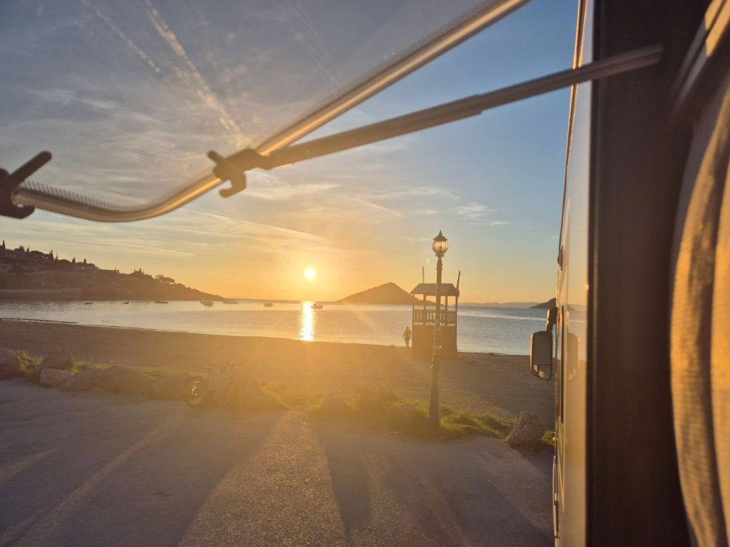 We stopped at Siviri on the first finger, Kassandra. Another beach resort town. Tavernas all busy setting reserved signs on tables. A good coffee at one. Then a short hop up to a modern amphitheater car park. Jobs: admin, hand balling water, cleaning, windows etc. a UK van for 10 mins and a learner stalling and in and out of the car park. Super quiet.