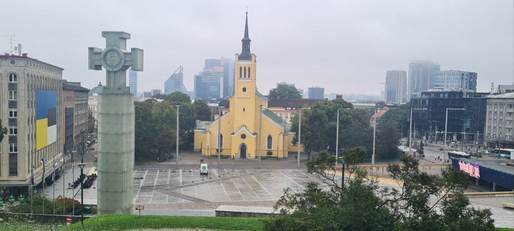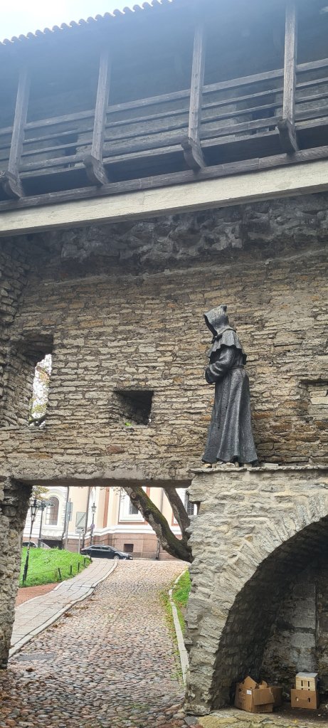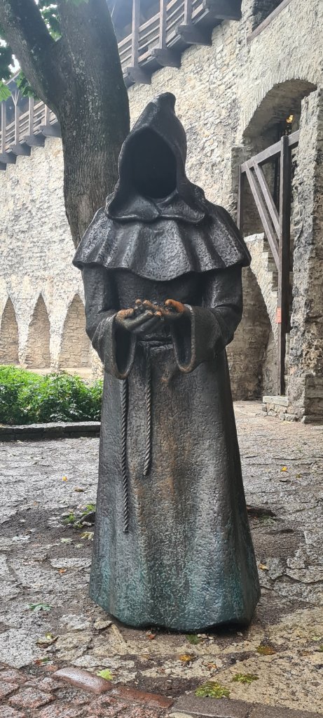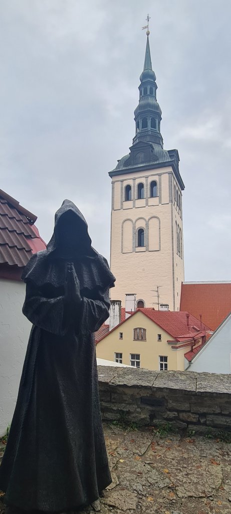 Wet misty first view of the old town wallAlexander Nevsky Cathedral built late C19 as part of the Russanification. During the inter war independence, Estonia planned to pull it down. They didn’t have the funds for such a huge demolition project, so it survived. What was the castle is now the ParliamentA wealthy inhabitant decided there were insufficient statues in Tallinn and commissioned the monks, which now grace the Danish Kings GardenFreedom Square. The cross monument was built early 1990’s at huge expense and the glass sheets need annual repair. According to our guide, this and a public toilet are good examples of early independence corruption. It wasn’t until the turn of the century when Estonia was chasing joining the EU, that corruption was stamped out. EU and NATO were 2004. Euro was 2011. Lots of viewpoints, but oh, so misty in the stair rods. Tallinn actually has a proper hill in the city, making for views and a more interesting layout. Bear in mind, Estonia boasts the highest of the Baltic states mountains … at 318m. To put into perspective, Sca Fell Pike is 978m and Ben Nevis is 1345m.Cold and wet we splashed out on a lovely meal, including pud and a bottle of red!