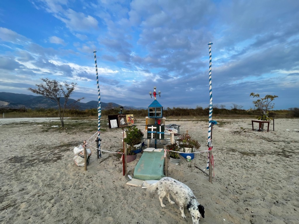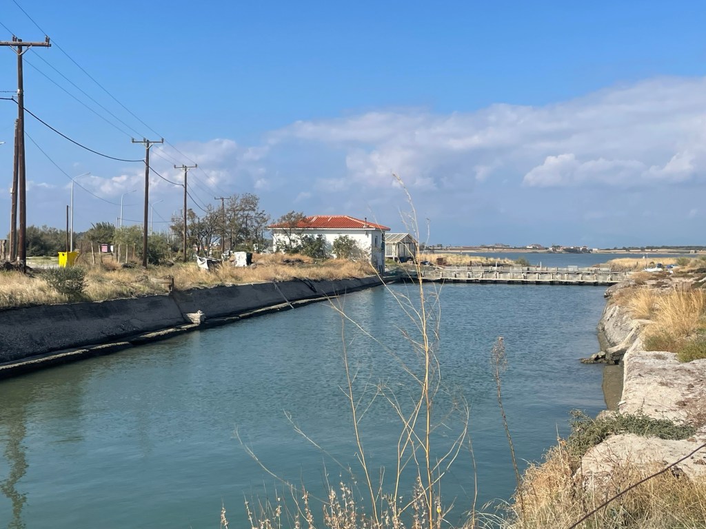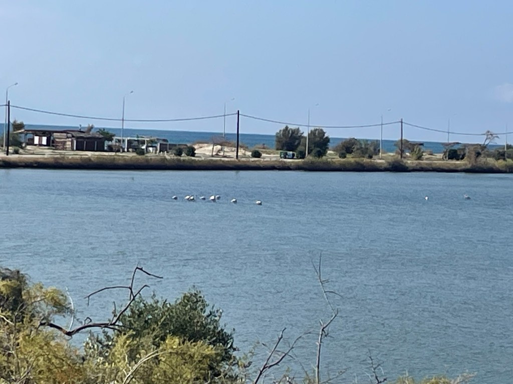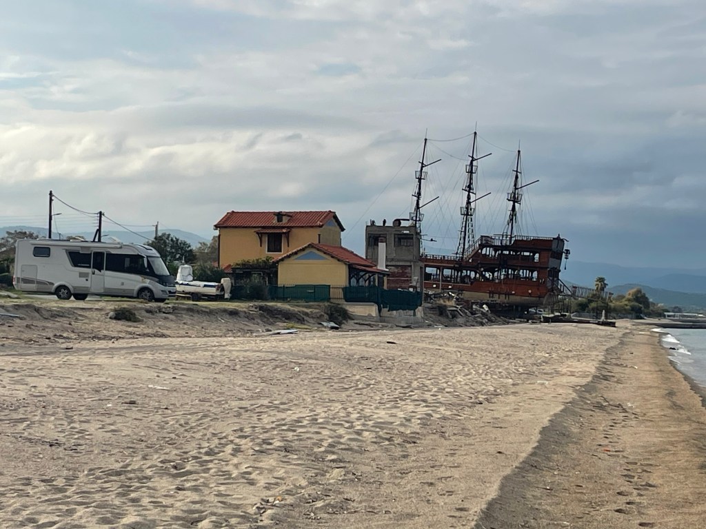 Salad and smoked mackerel at a lovely taverna. And a couple of glasses of wine. Our solitary spot has become a little congested as we’ve been joined by 3 other vans.