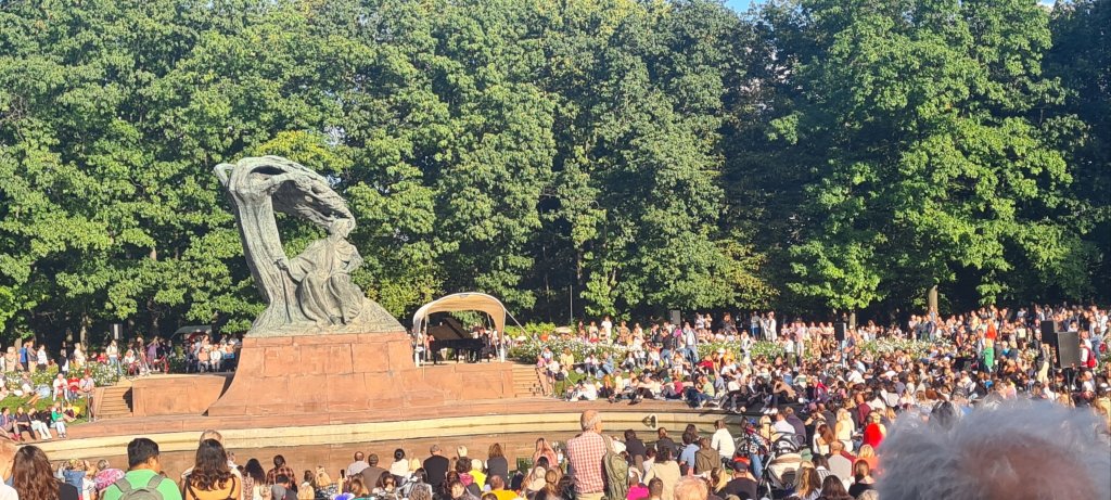 Simon had told us about the free Chopin concert in the park. We missed a bus and then got dropped by the bus right over the other side. Part of our route to the concert was barred by road works. And then we were evicted by a park official … no dogs in this park! We walked around the park, up the hill which Simon’s running club uses for hill training!, to the park’s main gate. Late and barred, we sat on a bench outside and listened.