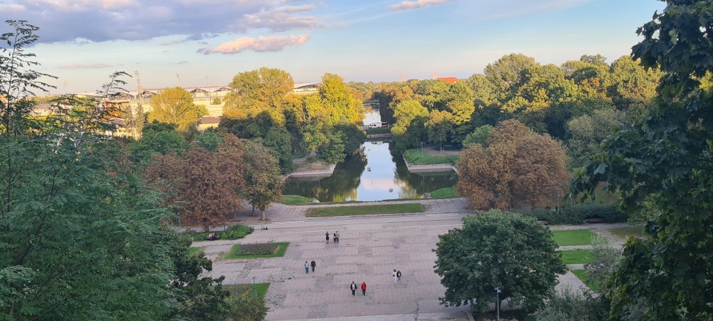 We met Simon after and went for a drink. Lovely view over the park we’d been barred from (have I mentioned that before?!) and of the Legia football stadium. We had passed loads of supporters walking to and around the park. And nearly as many policemen. And a squad of riot police with gas, shields and batons! Simon explained that Poland still has football hooliganism. Strange given how safe it is.
