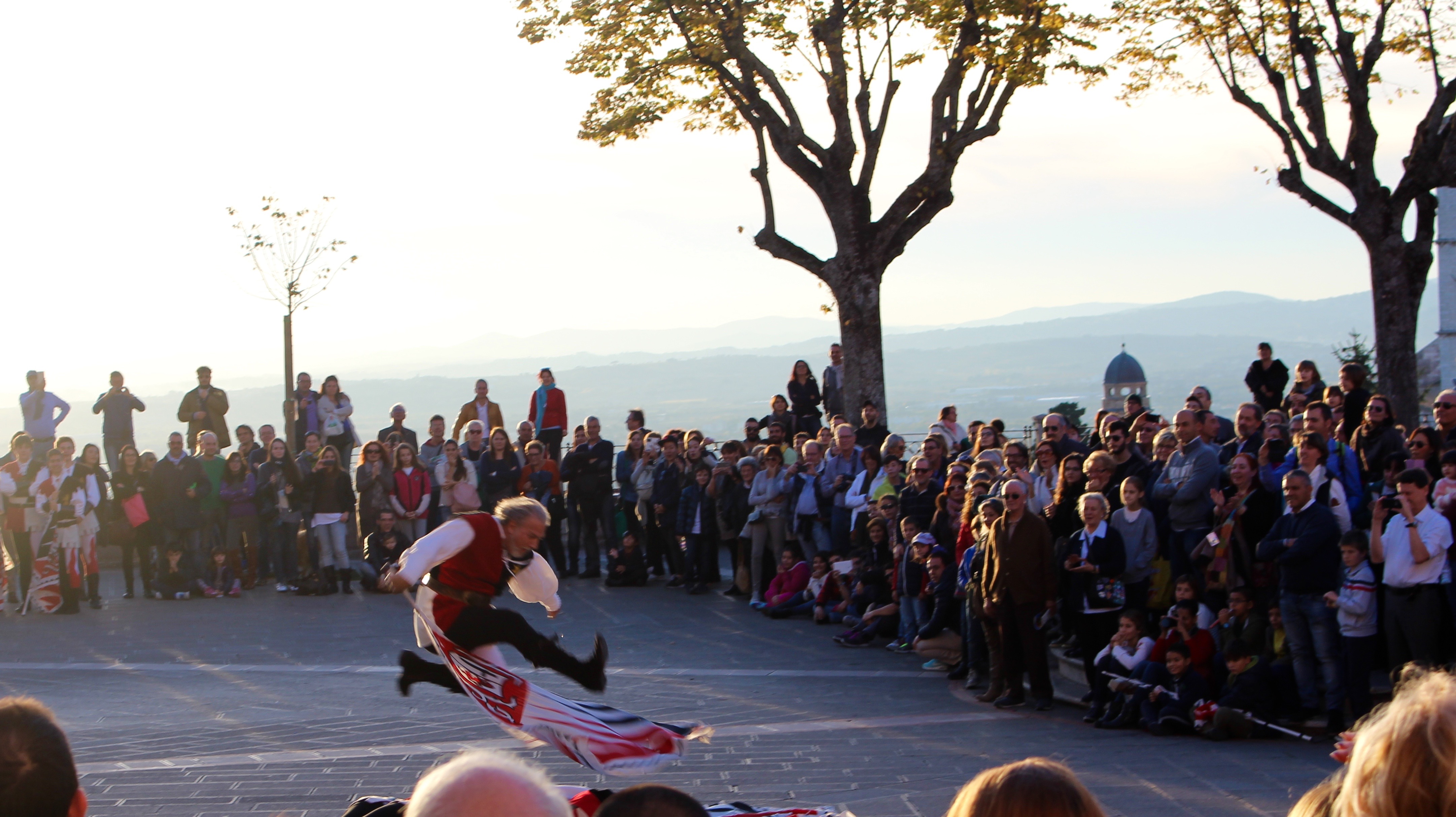 We heard drumming and horns and managed to catch a glimpse of a procession. We caught up with them again outside St Clare Church. As well as swirling and catching their flags they jumped over each other and then lay down to increase the distance the next combatant had to leap … then the drummed, blew their horns and marched off. Lovely.