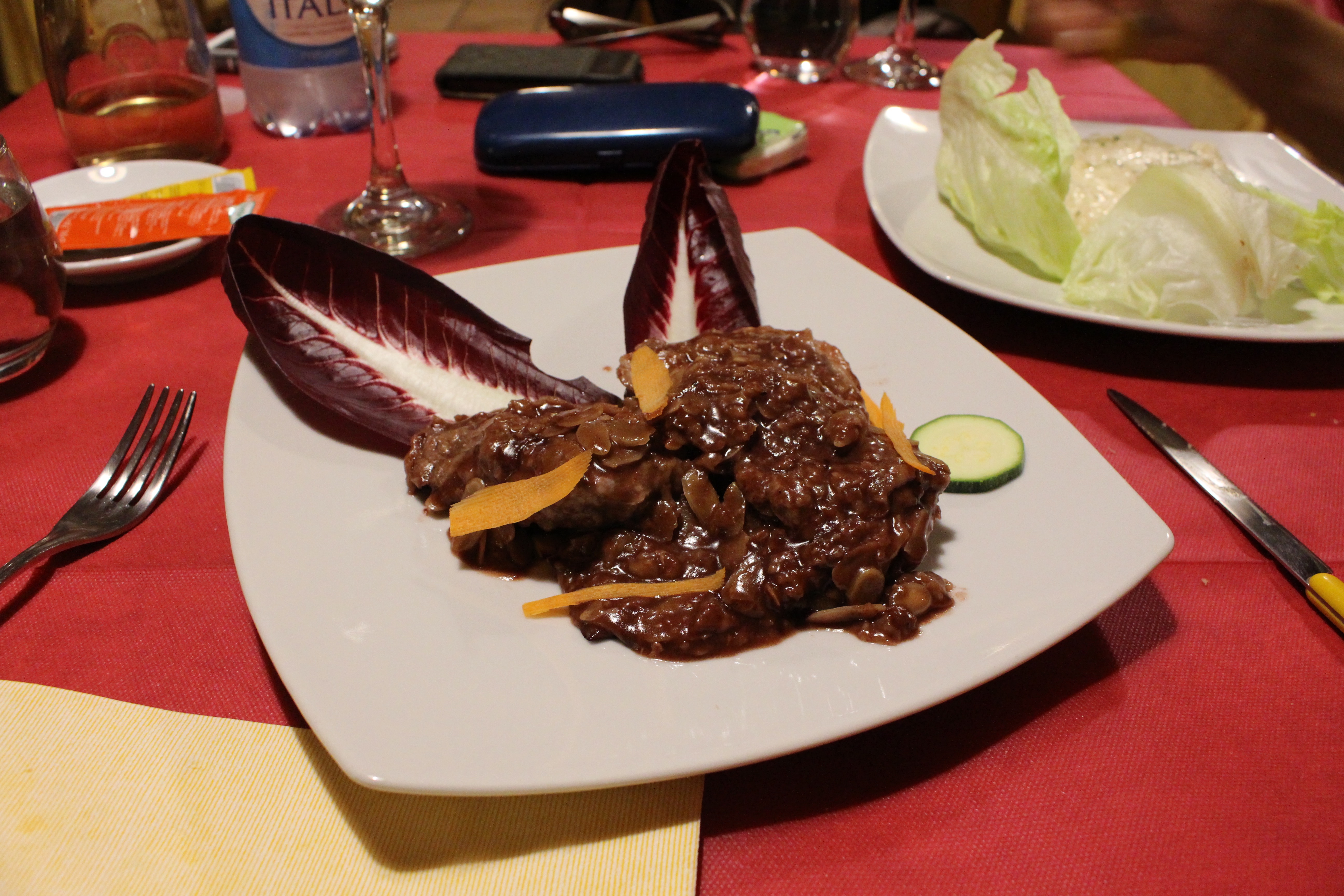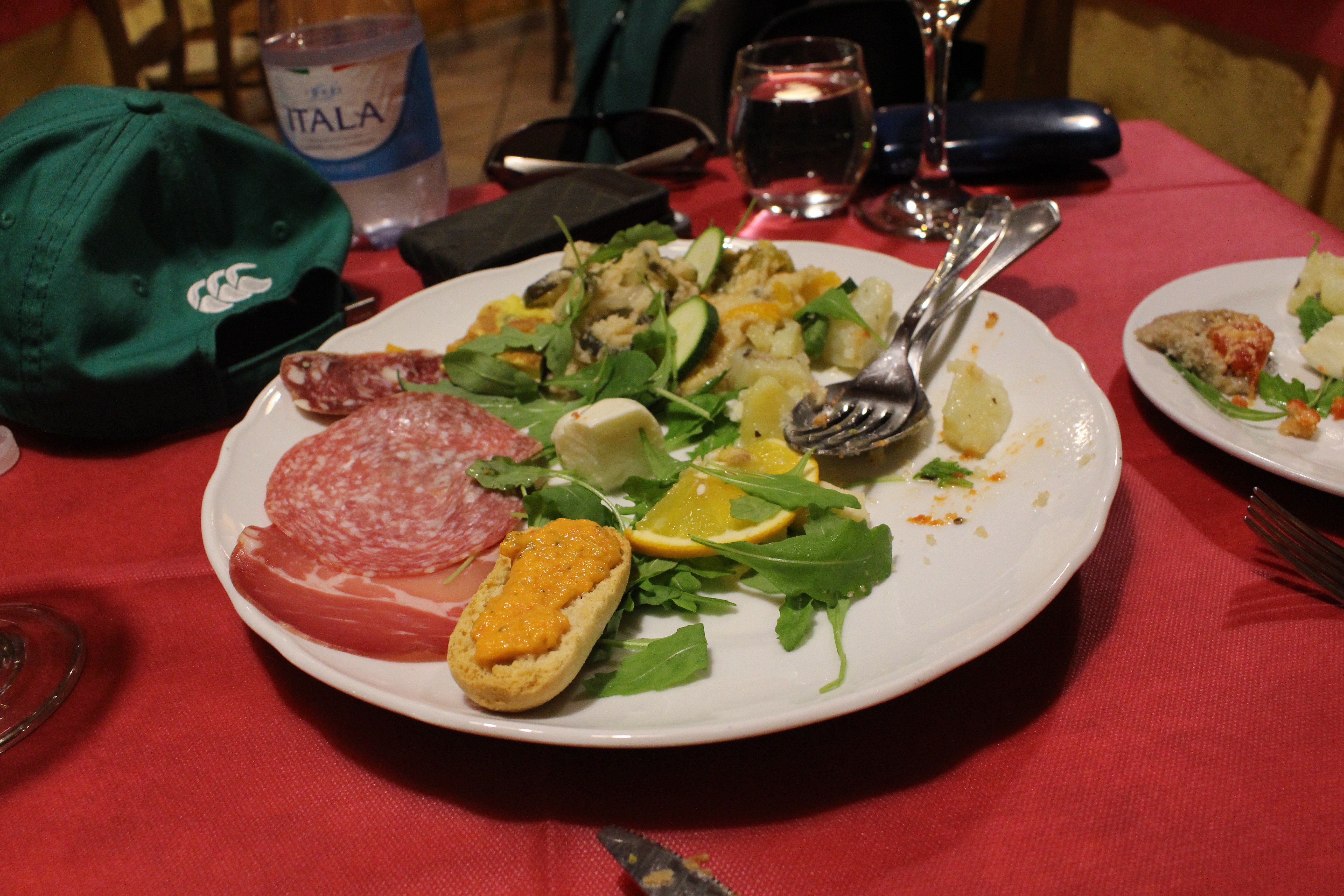 Now those who know us may deduce that we occasionally have a meal out! We turned a corner ‘a destra’ – and found a small restaurant which we initially thought was ‘chiusio’ – once again our reader is reeling with astonishment at my command of Italiano… The photos below don’t fully do justice our repast – a shared starter, two large main courses, a bottle of guess what? – vino collapse rossso/blanco – total cost £36 including tip!!!