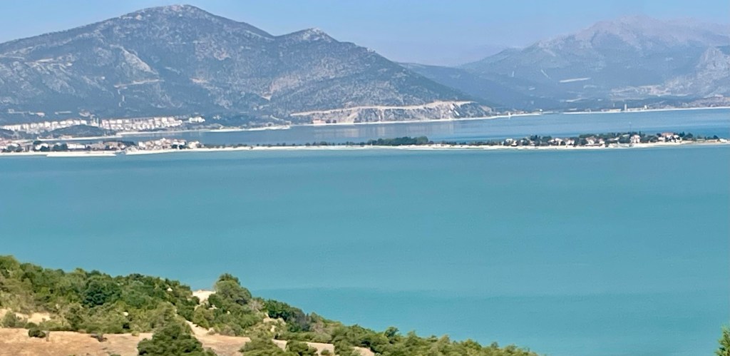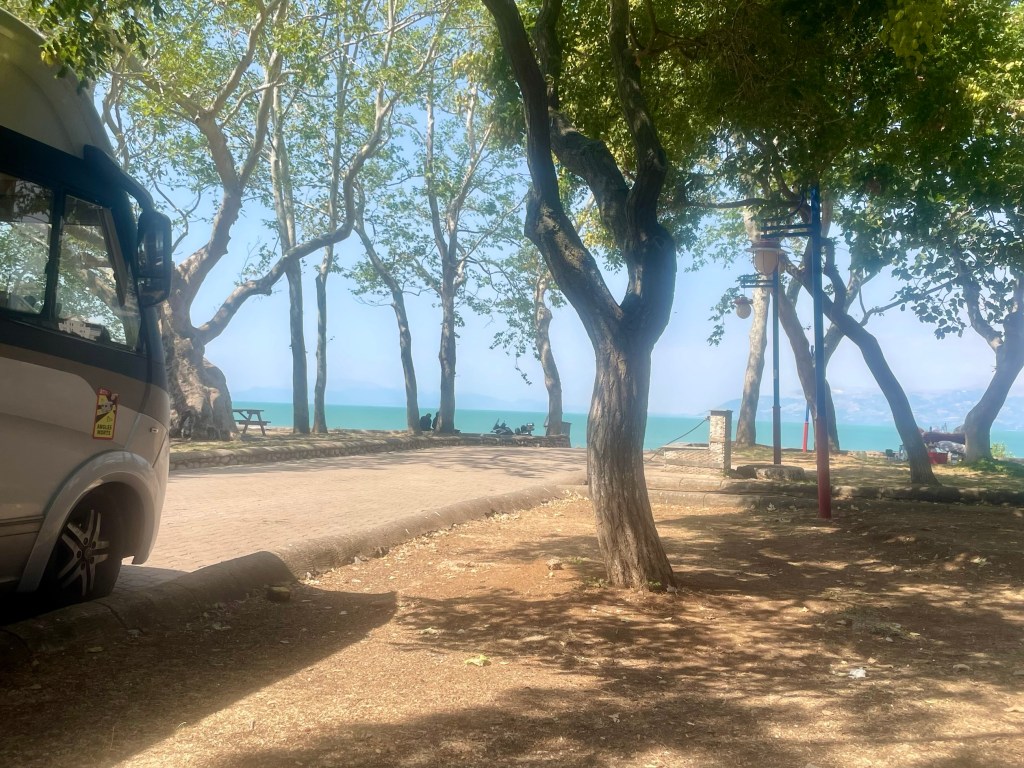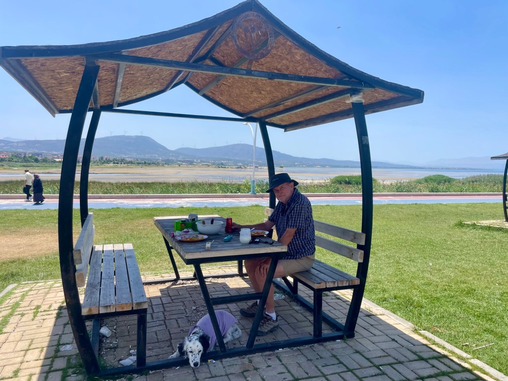James scribing – for a change! Lake Burdur was our place of wild camping last night – well not at the lake – too hot and no shade – so a nearby forest are with lots of shade. We had eaten at the lake – just relaxing wine at the site…