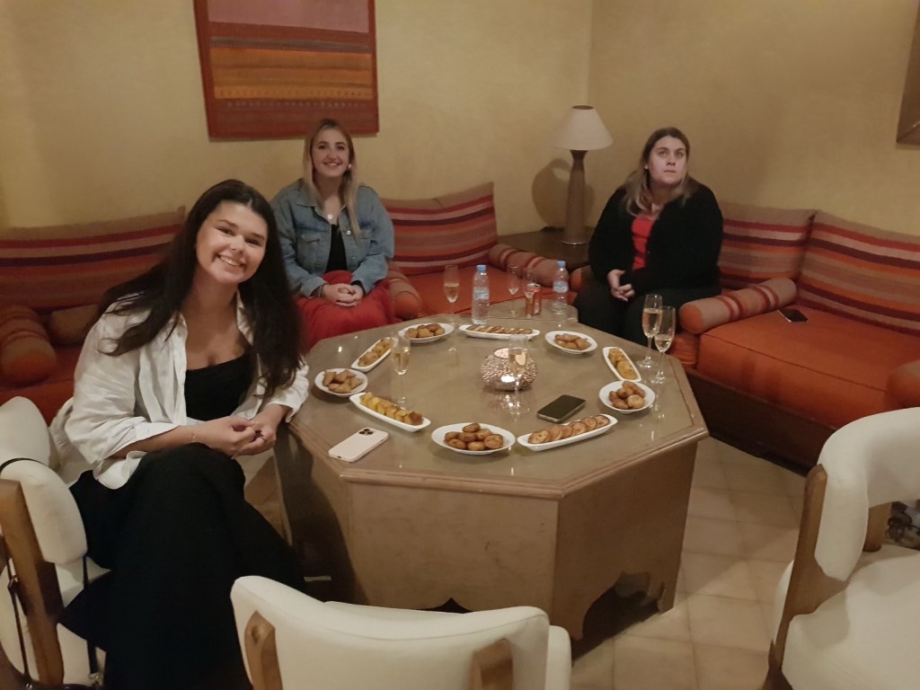 On arrival we were given a tour of the Riad and chose our rooms. Two buildings around a large pool. Huge suites. Heaters on. Lots of break out areas.